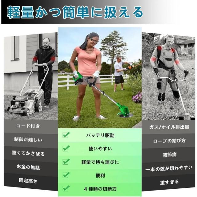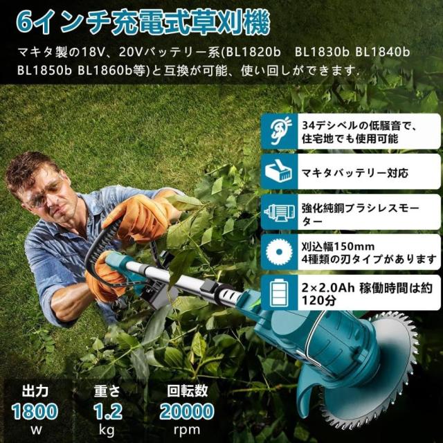 草刈り機 充電式 コードレス 芝刈り機 草刈機 6インチ 刈払機 電動 除草 軽量 庭 園芸 雑草 充電 軽量 安全 無線 替刃4種類 角度調整 バッテリー 充電器 付 送料無料 PSE認証