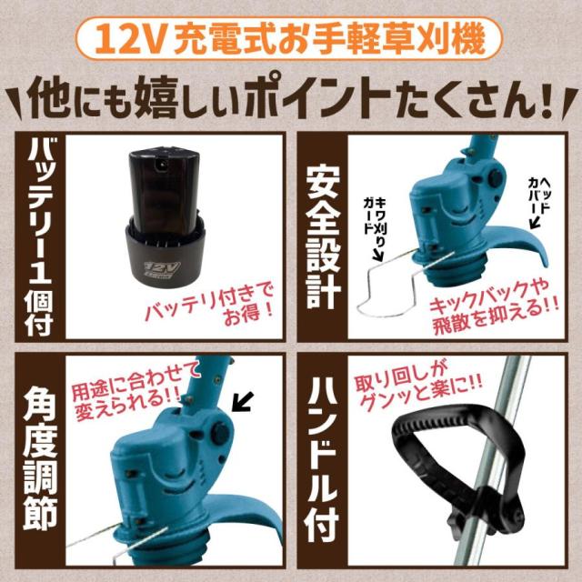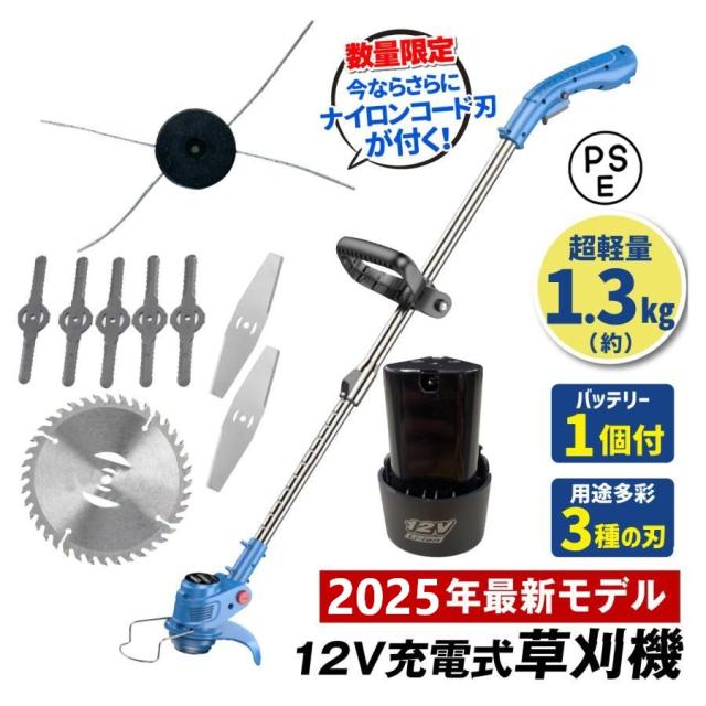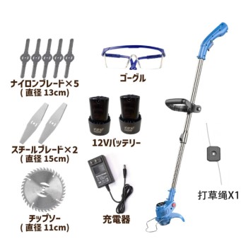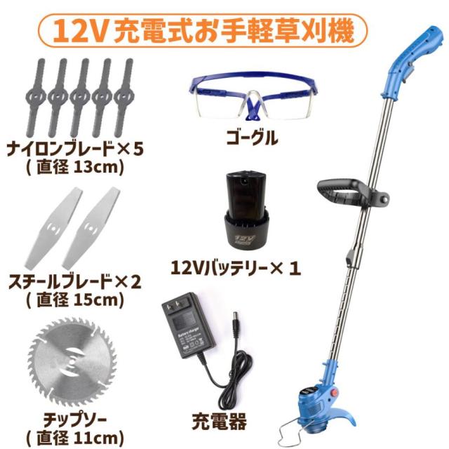 即納 草刈り機 充電式 電動 バッテリー1個/4種の替刃付き 12V充電式お手軽草刈機 強力 静音 家庭用 軽量 パワフル グラストリマー