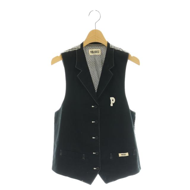 【中古】ピンクハウス ギンガムチェック 切り替え ベスト ロゴプリント 白 ホワイト 黒 ブラック
