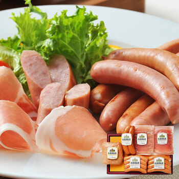 北海道産豚肉と玉葱を原料に肉本来の旨味と玉ねぎの甘みをギュッと閉じ込めたポークローフと北海道産豚肉に玉葱やチーズを練り込んで仕上げたウインナー、豚ロース肉をドイツの岩塩を使いじっくり調味した生ハムのセットです。