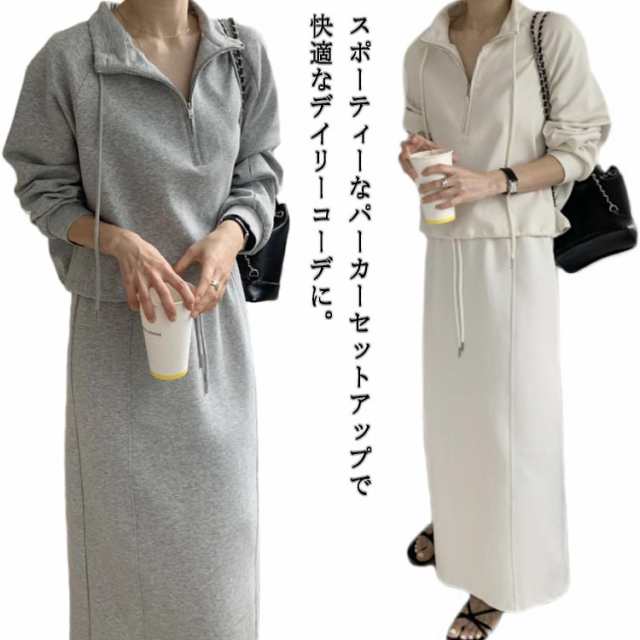 セットアップ ハーフジップ ロングスカート トレーナー パーカー 上下セット スカート セットアップ Iライン スウェット タイトスカート 長袖 ロングスカート オーバーシルエット ゆったり 楽ちん ウエストゴム