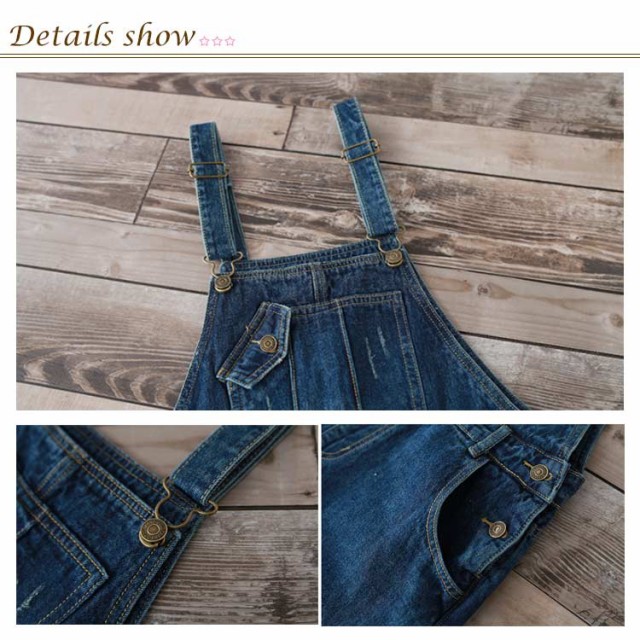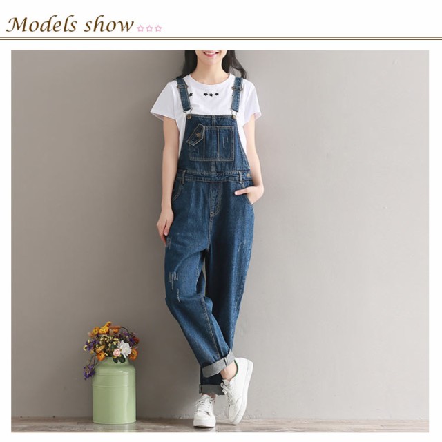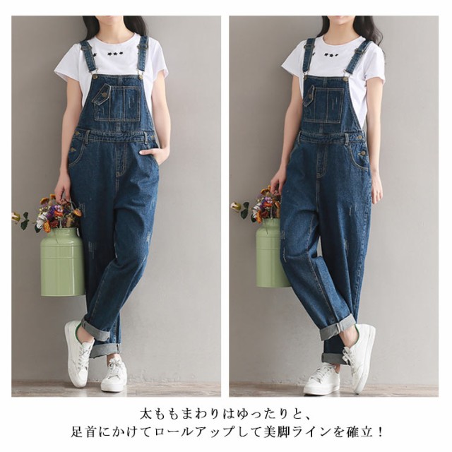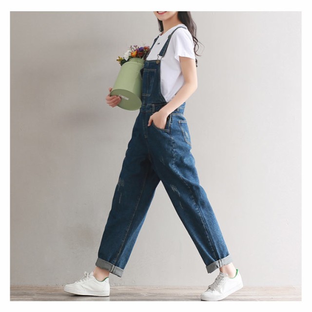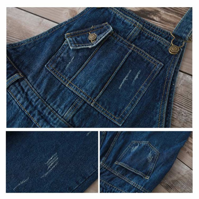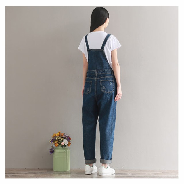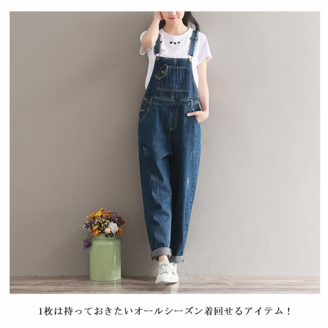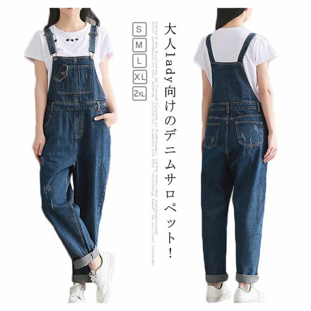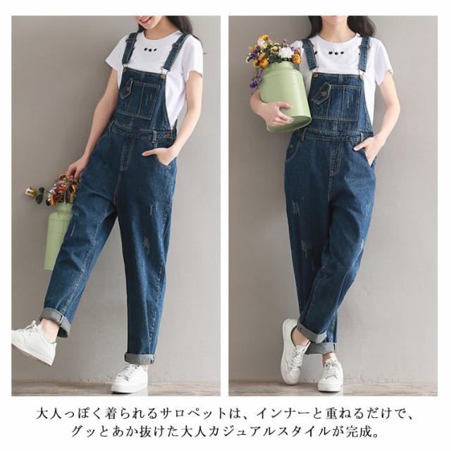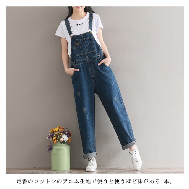 デニムサロペット オーバーオール レディース オールインワン サロペット ミドル丈 デニムパンツ デニム ボトムス サロペットパンツ ゆったり ダメージ加工 カジュアル