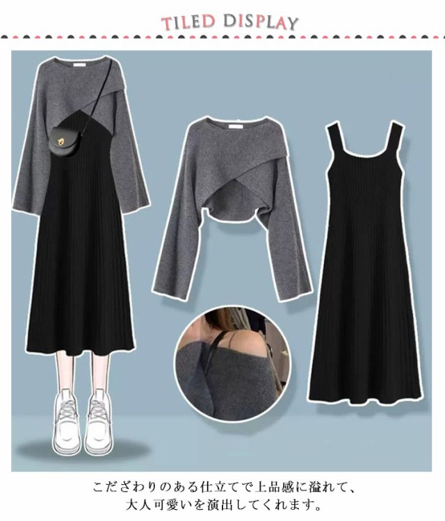 2点セット ニットセーター 上下セット 通学 ニットワンピース ニット クロス ワンピース ニットトップス 長袖 通勤 春秋 セットアップ オフィス 重ね着風 カジュアル ロングワンピース フレアワンピース Aライン 大人 ミモレ丈 レイヤード風 レディース