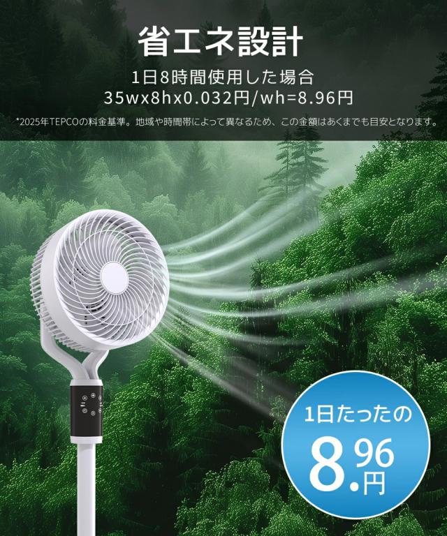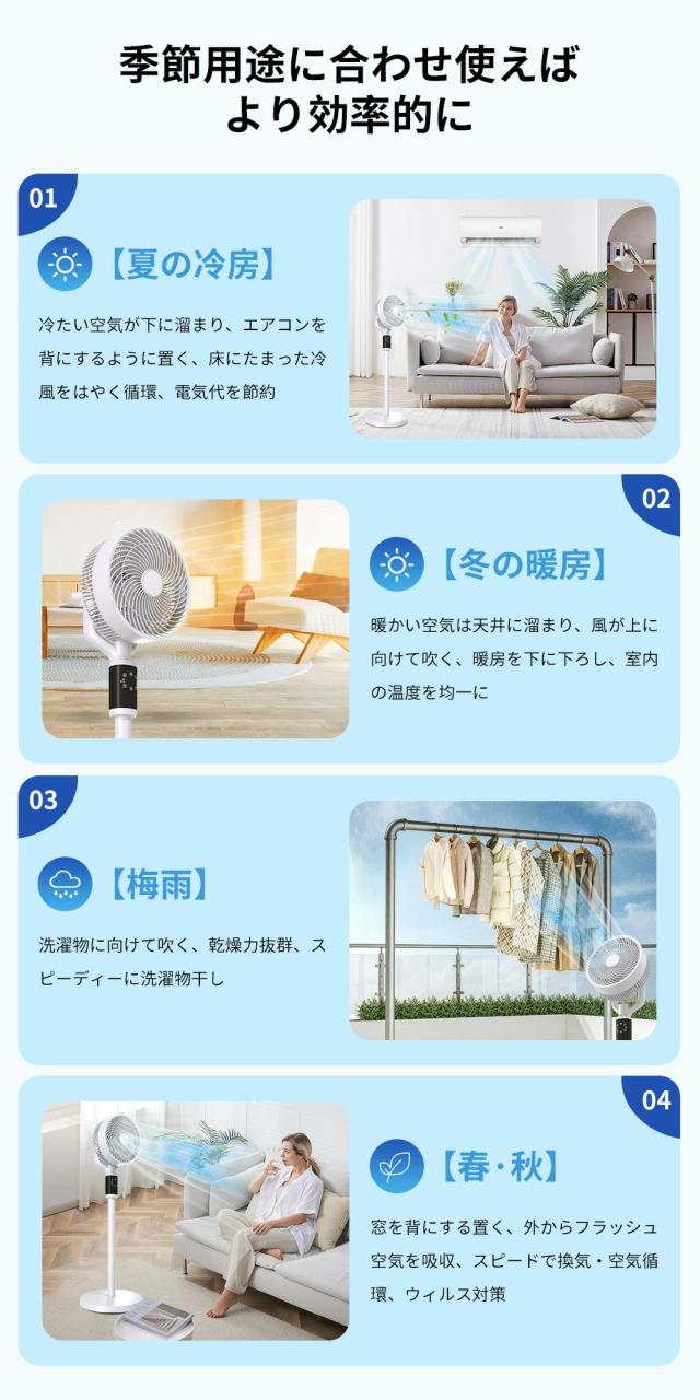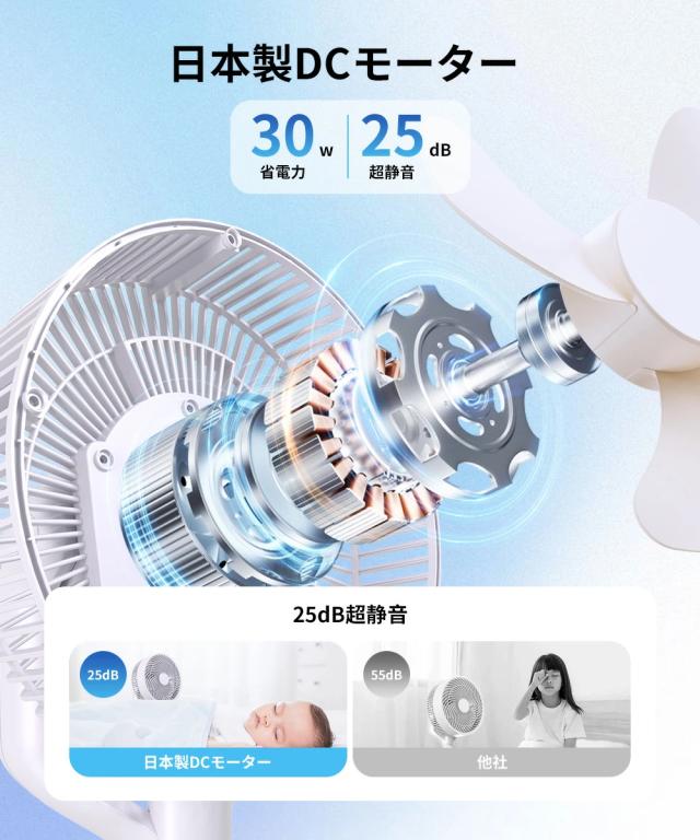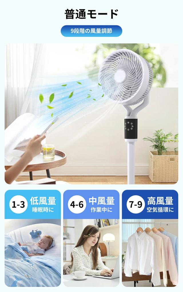 最大距離25mまでのパワフル送風で部屋の空気をもっと効率よく素早く循環させて、温度ムラを効果的に調整します。DCモーター搭載だから風を部屋の隅々まで送ることができる。9段階の風量を調整できます、最大風量を使用している場合、対応床面積はおよそ35畳です。リビング扇風機 直径17cmの3枚スパイラル羽根で風の吸い込み量を増やし、風を細かく切ることで、驚くほどの静音性を実現。