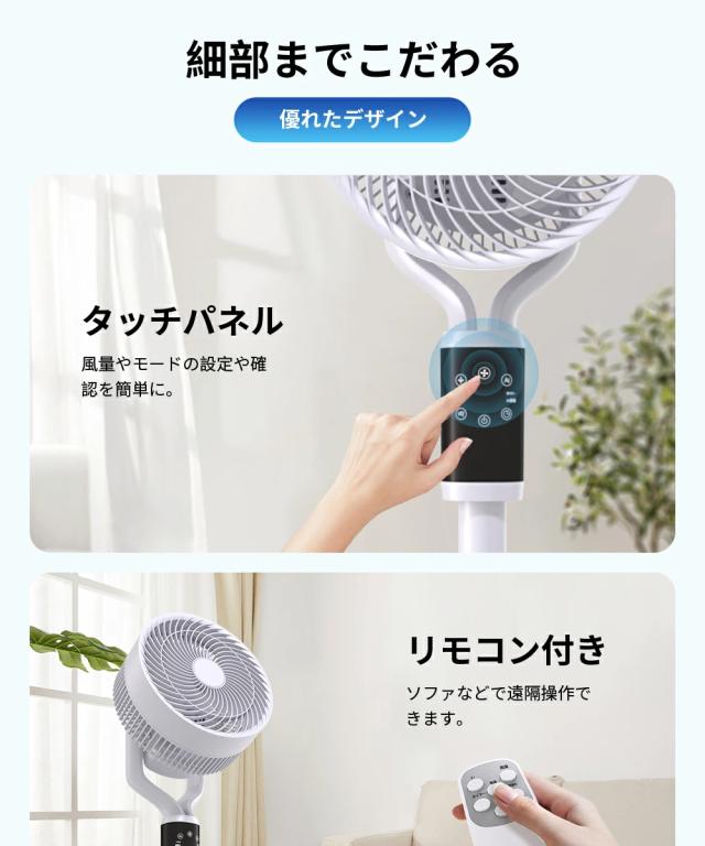 このサーキュレーターをはタッチセンサー式の操作パネルを採用し、指で触れるだけで簡単に操作できます。付属のリモコンですべての機能を制御でき、ソファやベッドに横たわったまま、いつでも風速を調整または切り替えることができ、より便利で省力化できます。