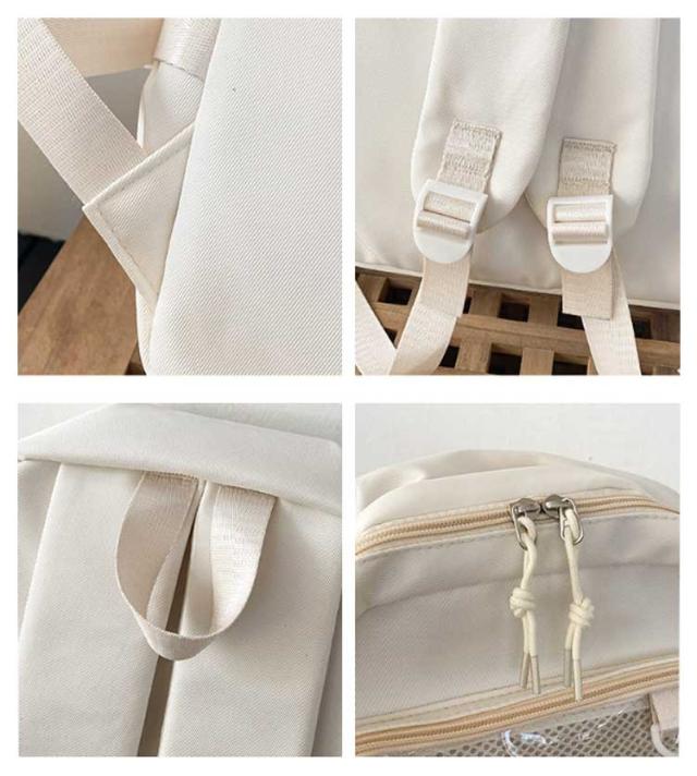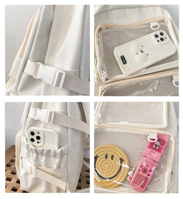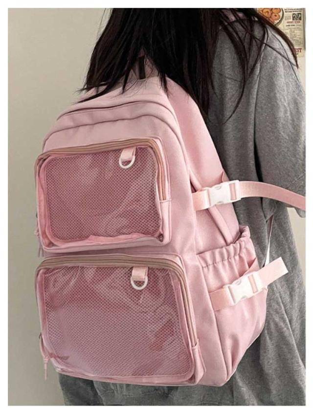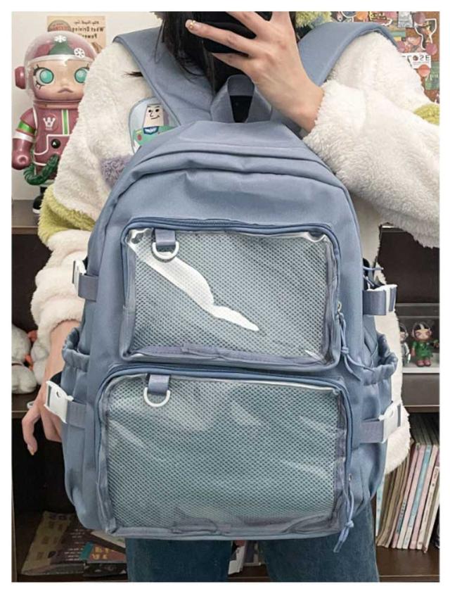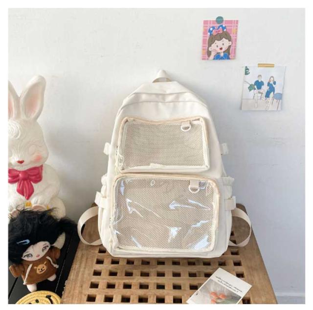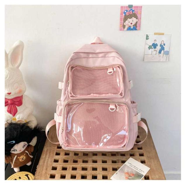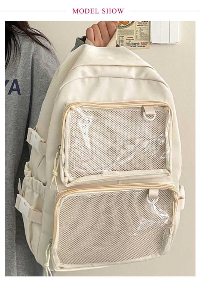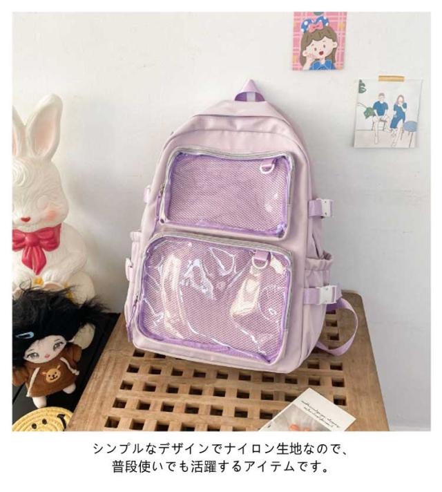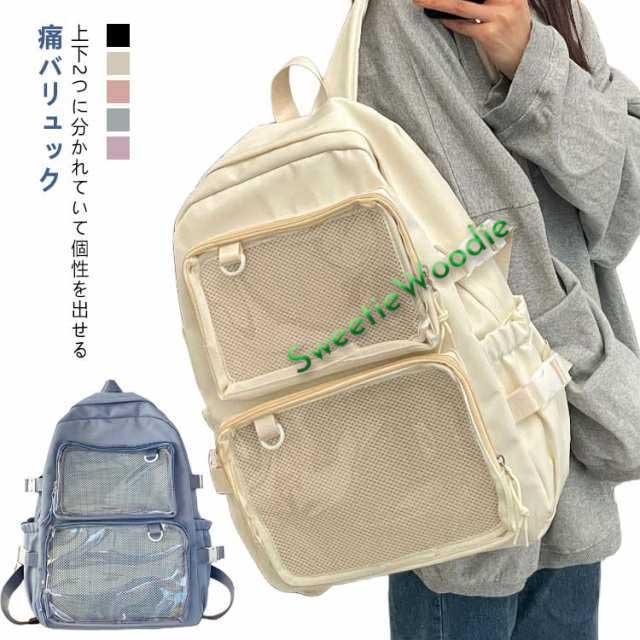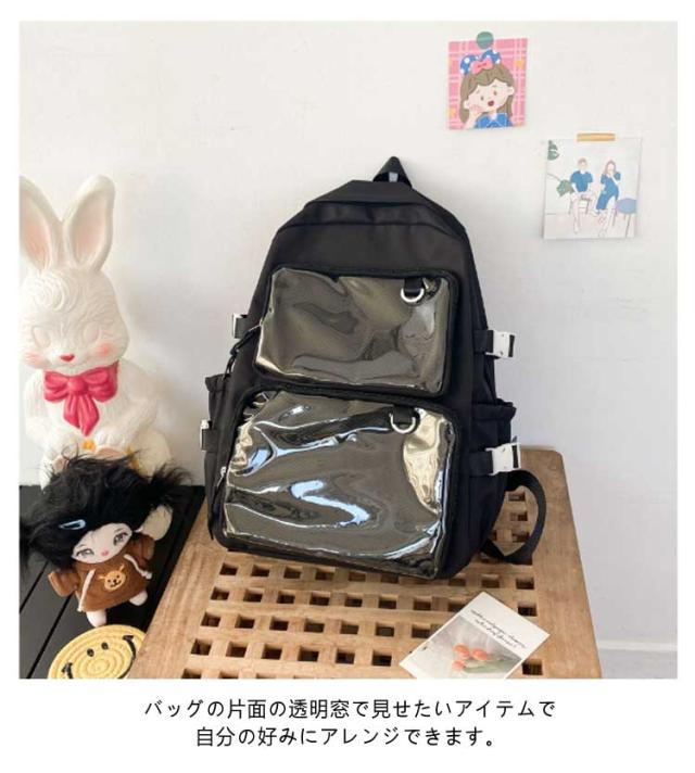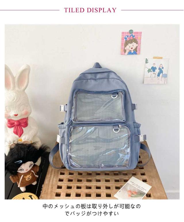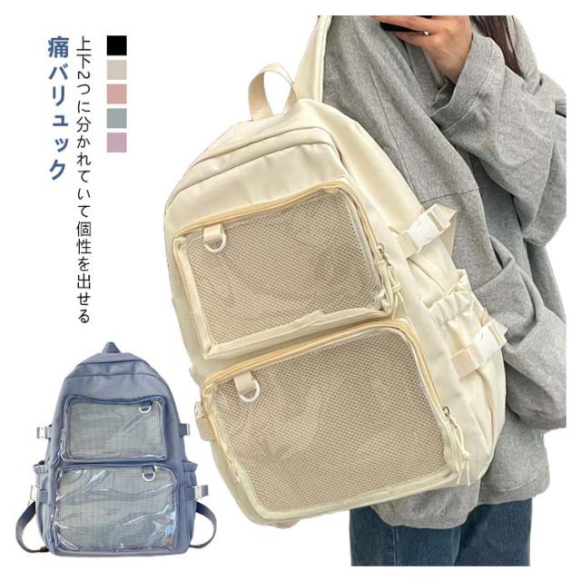 | 上下2つに分かれていて個性を出せる痛バリュック 中のメッシュの板は取り外しが可能なのでバッジがつけやすい◎ バッグの片面の透明窓で見せたいアイテムで自分の好みにアレンジできます。 シンプルなデザインでナイロン生地なので、普段使いでも活躍するアイテムです。 | |