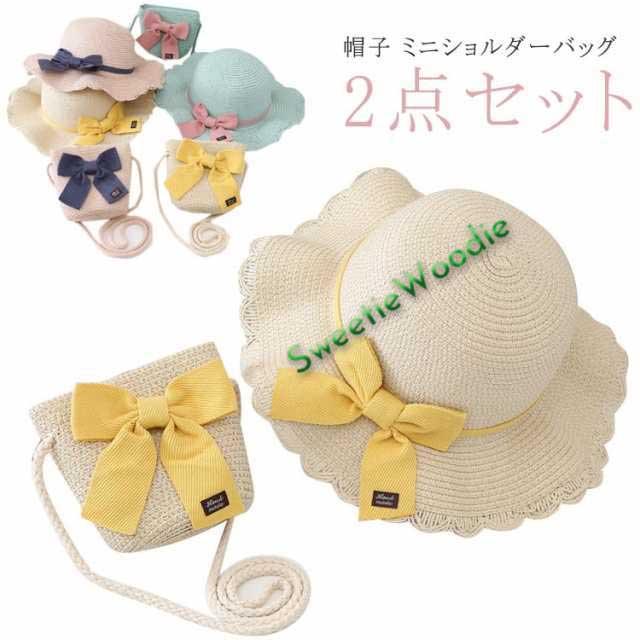 リボン麦わら帽子+ミニショルダーバッグのセット!麦わら帽子 キッズ 子供帽子 ベビー ベビー帽子 ゴム紐付き 折りたたみ 2点セット 女の子 可愛い かわいい 暑さ対策 紫外線対策 日よけ おでかけ アウトドア 海 ビーチ 公園 旅行 春夏 52cm