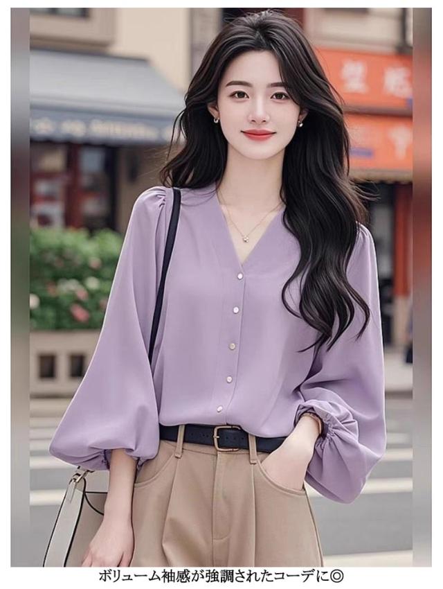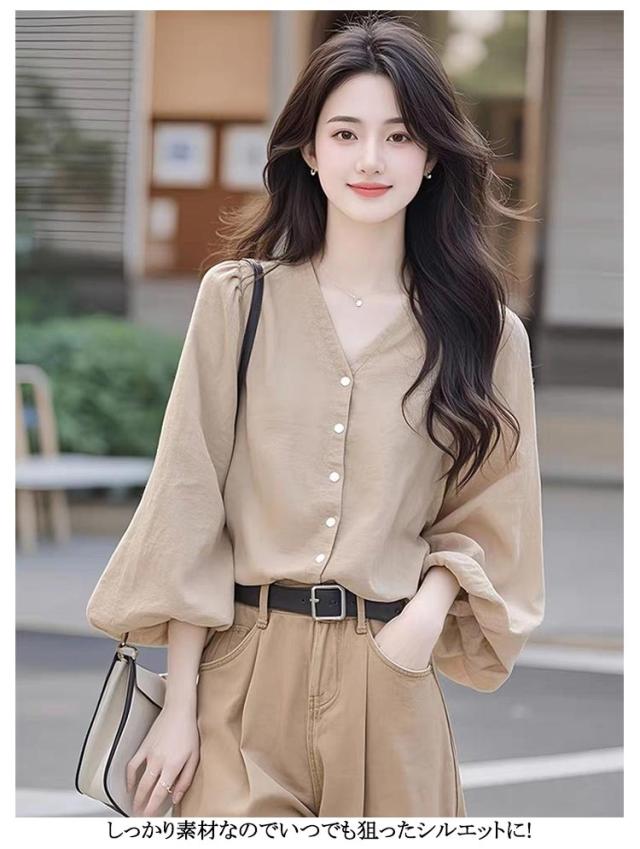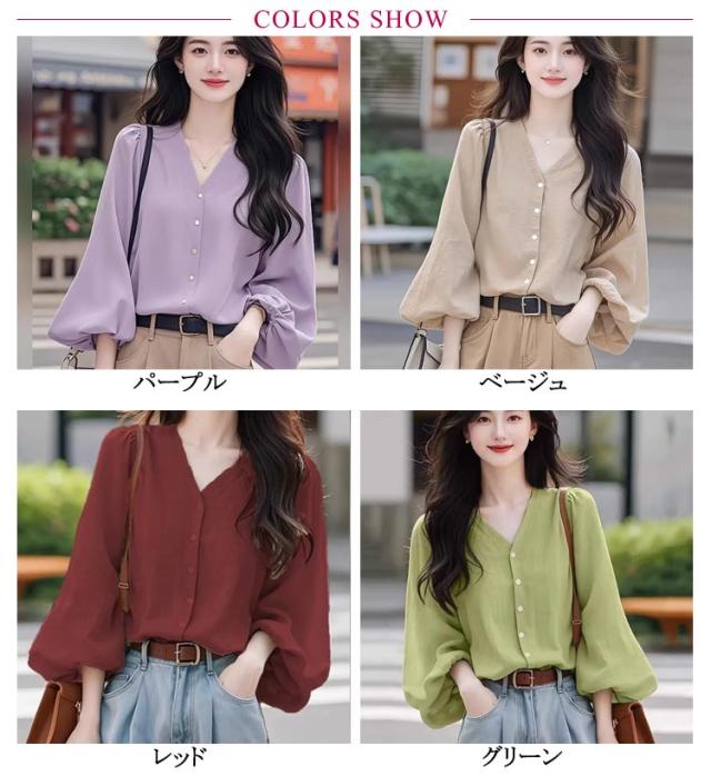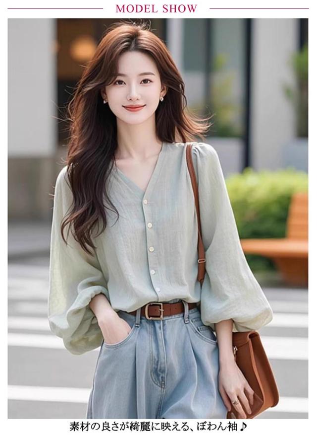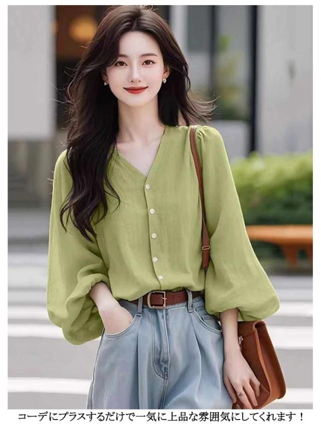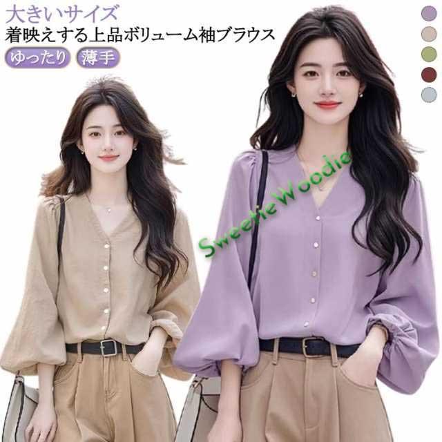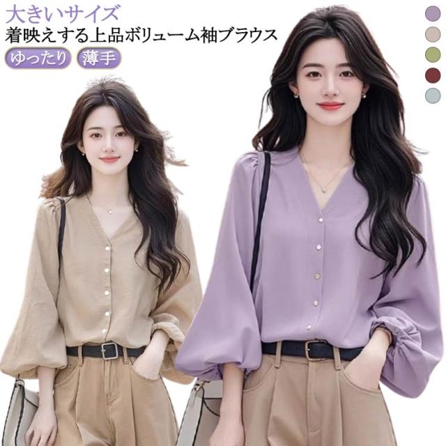 ボリューム袖 長袖 オフィス フェミニン バルーン袖 トップス おしゃれ ブラウス 春服 秋服 通勤 Vネック 大きいサイズ ゆったり 薄手 無地 ブラウス ビジネス きれいめ 事務服 シャツ カジュアル ブラウス ボリューム袖 送料無料 白 黒