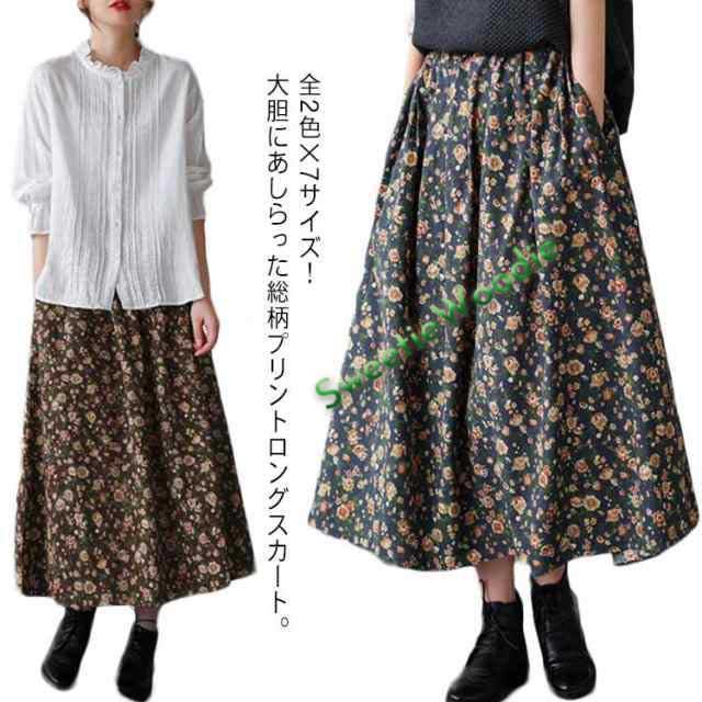 花柄スカート ミモレ丈 スカート 膝下丈 プリント フレアスカート おしゃれ ロングスカート 総柄 フラワー ウエストゴム 大きサイズ 春 夏 秋 Aラインスカート