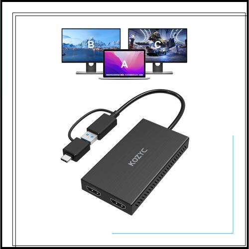 【USB 3.0デュアルHDMIアダプター】このKOZYC USBからHDMIアダプターは、USBポートを2つのHDMIデバイスに接続できます。同期出力4K 30Hzおよび1080P 60Hzをサポートします。USB-C、USB-A、Thunderbolt 3/4、およびUSB 4標準ポートに対応しています。