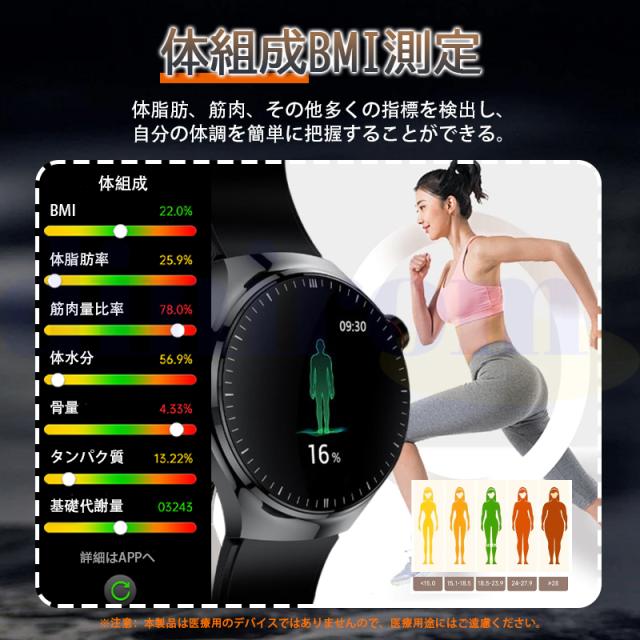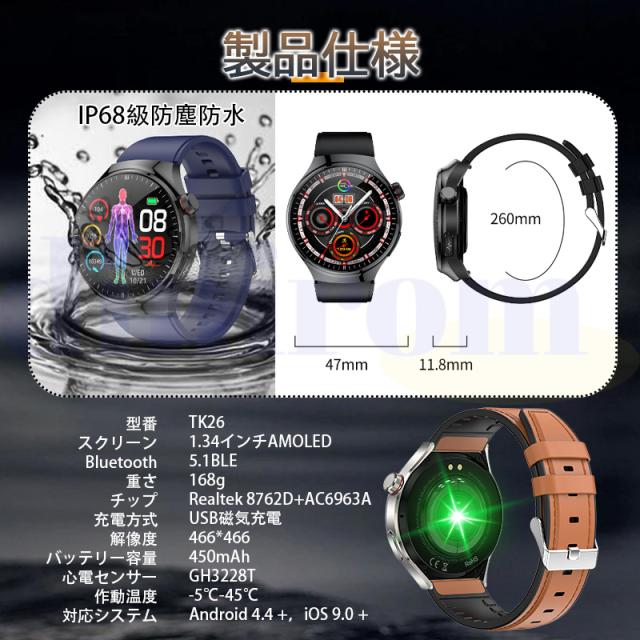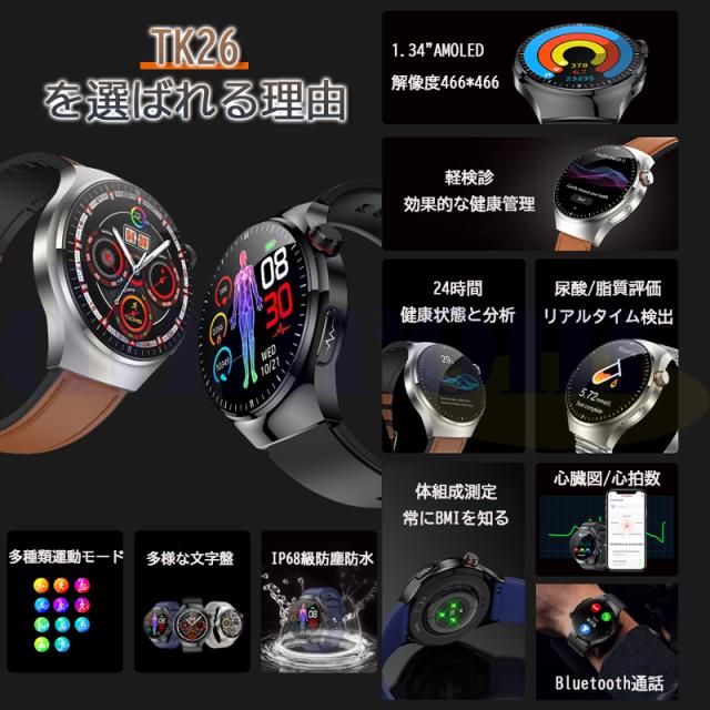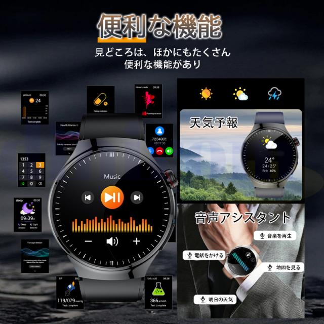 五臓の健康管理、血液成分分析、体組成分析、ECG+PPG心電図、体温、血中酸素、通話機能付き、24時間自動血圧測定や心拍数などの測定機能を一瞬で確認でき、スマホと同期した後アプリで健康状態データを一目で分かります。