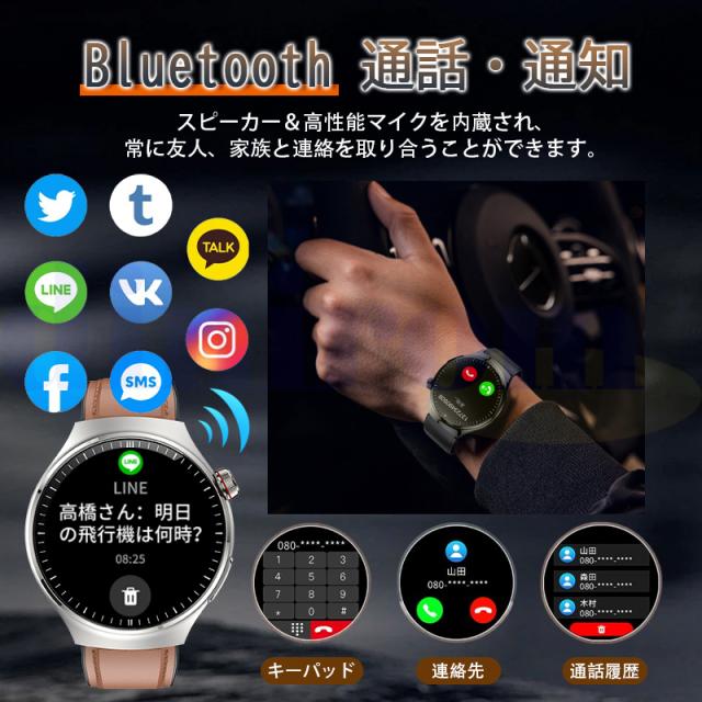 スピーカーと高性能マイクを内蔵し、スマホを取り出すことなく通話ができるスマートウォッチで、毎日の仕事や生活、ドライブに大きな利便性を提供します。専用アプリと接続すると、スマートウォッチから直接電話をかけたり、応答したり、スピーカー機能をオンにしたりできるほか、通話履歴の確認や通話履歴の保存も可能です。 通話相手の名前と電話番号が時計に表示されます。また、smart watchには音声アシスタント機能が搭載されています。 さらに、LINEやFacebook、Twitterなどの通知もお知らせしてくれるので、大切なメッセージを見逃すこともありません。通知の振動の強さは、時計側で設定できます。