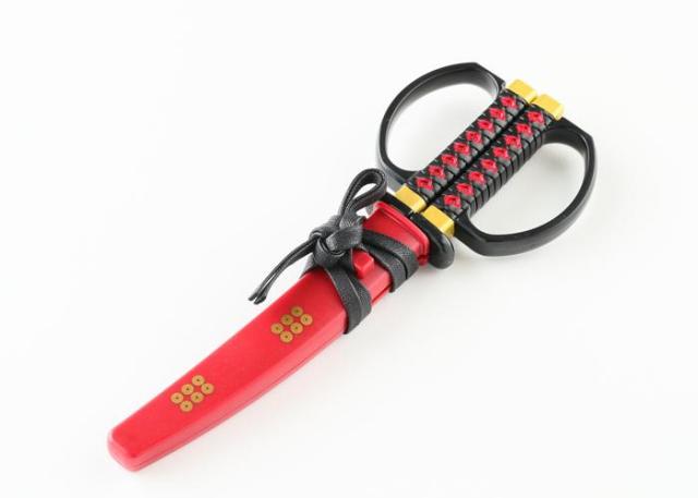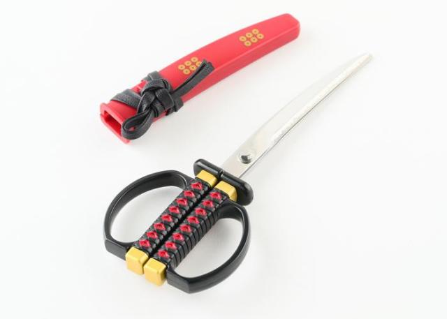 商品詳細:真田幸村の愛刀をイメージしたハサミです。鞘には真田家の家紋」六文銭」が入っております。掛け台付きのため、ハサミとして使わない時でも部屋に飾って楽しむことができます。刃体がカーブしており、硬いものも逃がさずスムーズに切れます。刃物の町岐阜県関市の職人が1本1本丁寧に刃付けをしており、切れ味抜群です。 生産国:日本 素材・材質:ブレード:ステンレス刃物鋼(ミラー仕上げ)、ハンドル:ABS 商品サイズ:全長:180mm、刃長:上刃87mm・下刃82mm 重量:66g 仕様:ハンドルカラー:黒