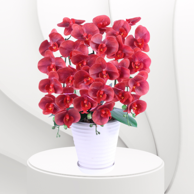 花緑の楽園 人工観葉植物 胡蝶蘭9輪3本立レッド陶器鉢 受け皿付き 光触媒品 日本製 職人手作り