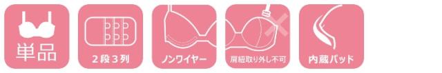 | ストラップ取り外し:不可 ストラップ長さ調節:可 パッド:あり(内蔵型) パッド取り外し:不可 ワイヤー:なし ホック:2段3列 ブラジャー単品 |