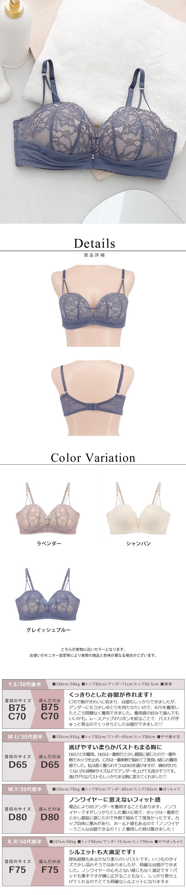 ※モニター環境により、色味が実際の商品と若干異なる場合がございます。 ※記載のセット内容のみの販売となり小物等は含まれません。 ※お洗濯の際は、洗濯表示(ケアラベル)の取扱い絵表示と注意事項をご確認ください。 ※常に商品改良を行っており、ご購入いただくタイミングにより仕様や着用感が若干異なる場合がございます。 u372 ノンワイヤー ブラジャー ノンワイヤーブラ ワイヤーレス 丸胸 ふっくら モールドブラ デコルテ 補正 盛り 谷間 寄せ 谷間メイク モールドカップ バストメイク ブラジャー 下着 ブラ単品 ナチュラル 自然 楽 痛くない レース かわいい おしゃれ 可愛い ソフト補正 脇肉 脇肉カバー 脇高 ナチュ盛り ストレスフリー champagne シャンパン lavender ラベンダー blue ブルー グレイッシュ くすみカラー 淡色 |