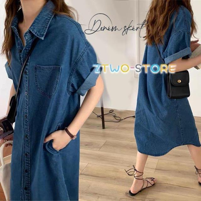 デニムワンピース レディース 半袖ワンピース シャツワンピ ワンピース 半袖 夏 ロングワンピ デニム ミモレワンピース ロングシャツ レトロ