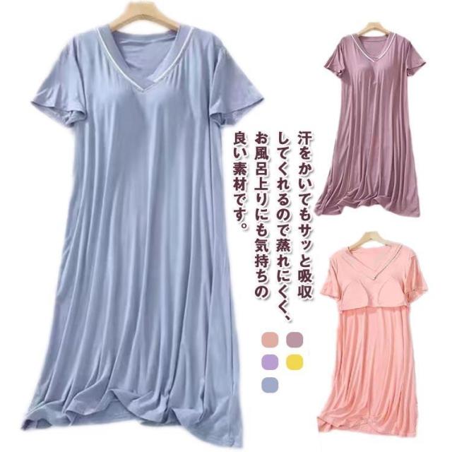 vネック カップ付き ワンピース 半袖 涼しい ひんやり アイスシルクパジャマ ルームウェア レディース 涼感ワンピース 薄手 春 かわいい 可愛い