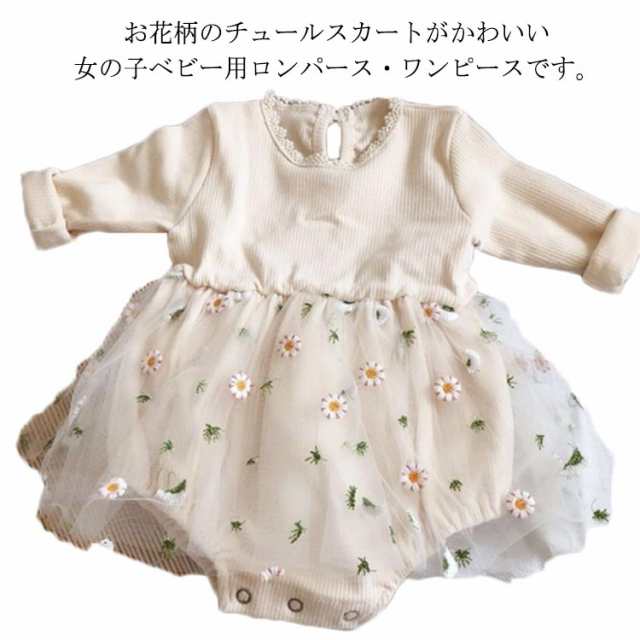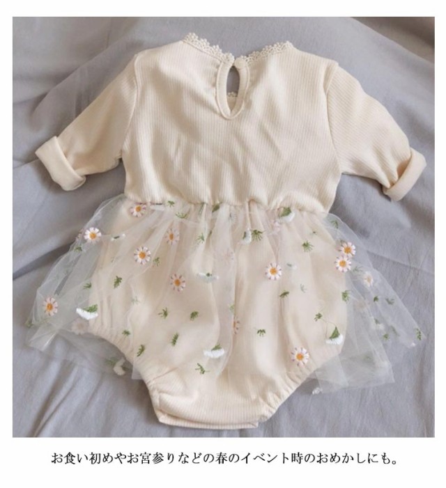 | お花柄のチュールスカートがかわいい女の子ベビー用ロンパース・ワンピースです。 リブ素材で伸縮性もあります。 優しいクリーム色とチュールのお花が絶妙におしゃれです。 インスタ映えもバッチリ。 お食い初めやお宮参りなどの春のイベント時のおめかしにも。 出産祝いとしてもおすすめです。 | |