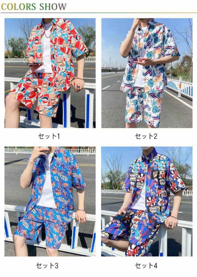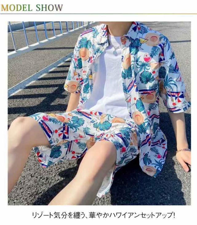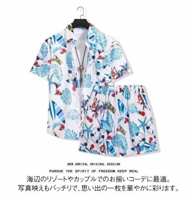 セットアップ アロハシャツ ペアコーデ 夏 メンズ 薄手 シャツ 海 ハワイ旅行 ビーチウェア カップル服 アロハシャツ 花柄シャツ 短パン 旅行 涼しい 上下セット 夏コーデ