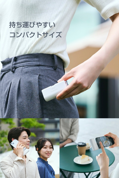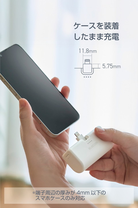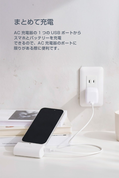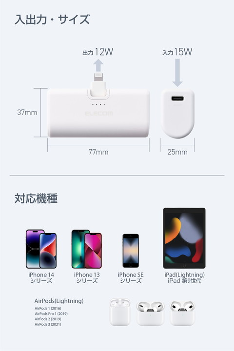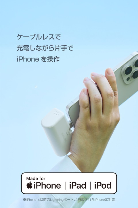 Lightning対応のiPhoneに一体型コネクターを直接挿して充電できる、コンパクトサイズのモバイルバッテリーです。ケーブルいらずで、これ一つでサッと手軽に充電できます。ストレスフリーに持ち運べて、外出先でも重宝します。![]() ■Lightning対応のiPhoneやiPadに一体型コネクターを直接挿して充電できるモバイルバッテリーです。充電中のケーブルの煩わしさを感じず、どこにいてもサッと充電できます。 ■手のひらに収まるコンパクトサイズ。バッグのポケットやスマホショルダーなどにしまって持ち運べます。 ■コンパクトながら、Lightningコネクターの最大出力12Wで充電できます。 ■一体型コネクターは180度可動するスイング構造。余計な負荷からコネクターを守り、収納時は90度に折りたたんで安全に持ち運べます。 ■4段階のLEDランプでバッテリーの電池残量を一目で確認できます。 ■iPhoneを充電しながら、本製品にも同時に充電できる”まとめて充電”に対応しています。カフェや旅先など、充電ポートが一つしかない場面でも便利な機能です。 ■※iPhoneを優先的に充電します。iPhoneの充電完了後、本製品への充電を開始します。 ■容量は5000mAh。iPhone SE (第3世代)を約0.8回、iPhone 14を約0.6回、iPad (第9世代)を約0.3回充電できます。 ■約500回繰り返し使用可能なリチウムイオン電池を搭載。毎日使っても約1年半使用できます。 ■電池容量が160Wh(43,243mAh)以下であるため、機内持ち込みも可能。旅行や出張時のかばんに手荷物として入れられます。 ■※航空会社の規定によっては例外がある場合があります。予めご了承ください。 ■MFi認証取得済みのコネクターを採用しており、安心して使用できます。 ■本体・ロゴをワントーンで揃えたマットなカラーリングでどんなシーンにもなじむデザインです。 ■過充電・過放電・過電流防止機能・短絡保護機能・温度検知機能の5つの保護機能を備えた安心の回路設計に加え、PSEを取得。安全にご利用いただけます。 ■※日本の電気用品安全法(PSE)の技術基準に適合した安全性の高い製品です。 ■スマートフォンの充電ポート周囲の厚みが4mm以下のスマホケースは、装着したまま直挿しが可能です。 ■本製品を充電できる、USB Type-C - USB Type-Cケーブルが付属しています。 ■※USB Type-C and USB-C are trademarks of USB Implementers Forum. ■自社環境認定基準を1つ以上満たし、『THINK ECOLOGY』マークを表示した製品です。 ■環境保全に取り組み、製品本体の主たる構成部品や構成要素の原料に占めるリサイクル原料の割合が10%を超えている製品です。 ■環境保全に取り組み、製品の包装容器が紙・ダンボール・ポリ袋のみで構成されている製品です。 ![]() ■対応機種:iPhone 14シリーズまでのモデルなどLightningポートで充電する小型電子機器 ■定格入力電圧:USB Type-C(TM) port:5V ■定格入力電流:USB Type-C port:3A ■コネクター形状(電源出力側):USB Type-Cポート×1 ■コネクター形状(プラグ):Lightningプラグ×1 ■定格出力電圧:Lightningプラグ:5V ■定格出力電流:Lightningプラグ:2.4A ■電池種類:充電式リチウムイオン電池 ■電池定格容量:3.7V/5000mAh 18.5Wh ■充電時間:約2時間30分 ※製品本体のみを充電した場合の目安です。スマートフォンなどのモバイル機器を接続した場合は記載の時間では充電できません。 ■外形寸法:幅約77mm×奥行約25mm×高さ約37mm ■重量:約130g ■カラー:ホワイト ■くり返し使用回数:500回 ■使用温度範囲:0℃〜40℃ ■付属品:USB Type-C - USB Type-Cケーブル(0.1m) ■電気用品安全法:○PSE 特定以外の電気用品 ■保証期間:1年間 |