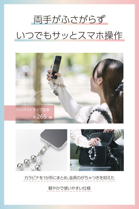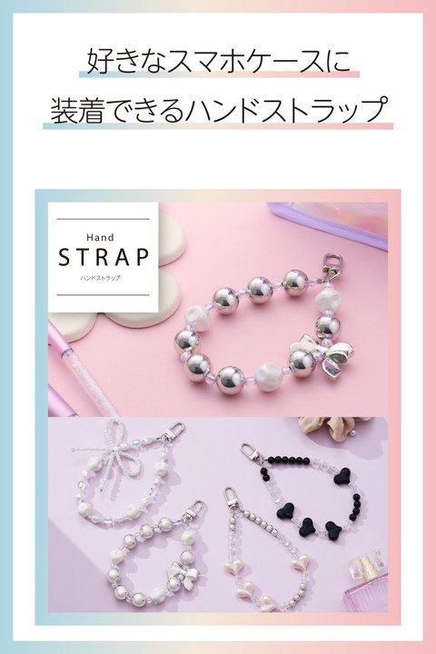 ころんとした大玉ビーズが存在感を放ち、シルバーリボンのアクセントでクールな印象も漂うハンドストラップです。手首や腕から提げて持ち歩けるので、両手がふさがらずいつでもサッとスマートフォンの操作ができます。耐久性の高いステンレスワイヤーを使用しており、見た目の華やかさと実用性を兼ね備えた仕様です。