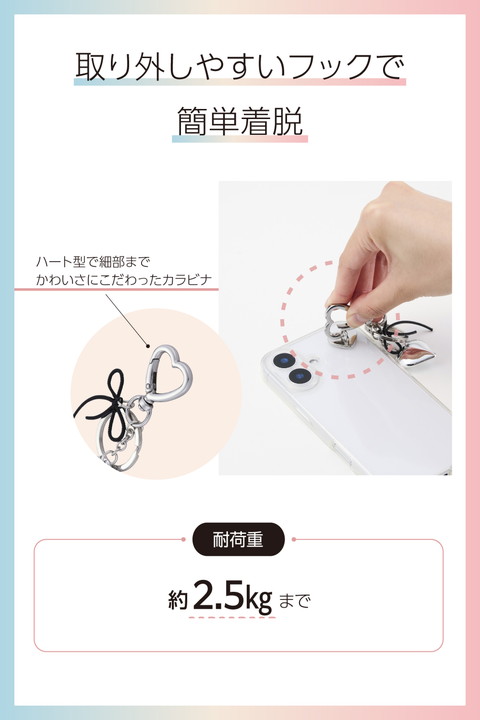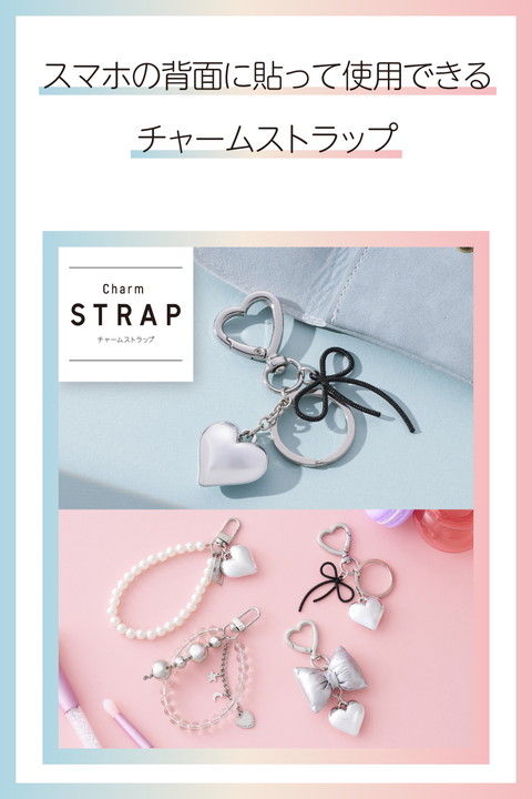 ブラックリボンの落ち着いた質感が、日常使いにほどよくなじむチャームストラップです。毎日持ち歩くスマホを、自分好みに手軽にカスタマイズできるアイテムで、気分に合わせておしゃれを楽しめます。スマホケースにストラップホールがなくても使える、強力粘着テープ付きのハート型チャームホルダーが付属しています。![]() ■さりげないブラックリボンが落ち着いた大人の雰囲気を演出するチャームストラップです。 ■キーリング付きで、お好みのストラップやキーホルダーを自由に追加して楽しめます。 ■ハート型で、細部までかわいさにこだわったカラビナです。 ■取り外しやすいフックを使用しているので、ストラップの着脱が簡単にできます。 ■耐久性の高いステンレスワイヤーを使用しています。 ■スマホの背面に貼って使える、ハート型のチャームホルダーが付属しています。 ■交換用両面テープが付属しているので、スマホケースを変えても付け替えられます。 ■強力な粘着テープでしっかりと固定できます。 ■※ケース背面に貼り付けてご使用ください。スマートフォン本体には直接貼り付けないでください。 ■※接着にはケースに幅約20mm×高さ約23mm以上の平らな面が必要です。 ■※貼り付け面の形状および素材によっては使用できない場合があります。 ■※ケースの種類は、ハイブリッドケース、ソフトケースをご使用ください(ケース背面が硬い素材のものを推奨します)。シリコン製のケースには使用しないでください。 ■※落下や破損の原因となる恐れがあるため、引っ張るなどの無理な力をかけないでください。 ■自社環境認定基準を1つ以上満たし、『THINK ECOLOGY』マークを表示した製品です。 ■環境への負荷軽減のため、輸送効率を高める設計の外装箱を使用した製品です。 ![]() ■サイズ:チャームストラップ:全長約55mm、チャームホルダー:W約20mm×D約9mm×H約17mm ■セット内容:チャームストラップ、チャームホルダー、両面テープ ■材質:チャームストラップ:ABS・亜鉛合金、チャームホルダー:亜鉛合金 ■カラー:シルバー |