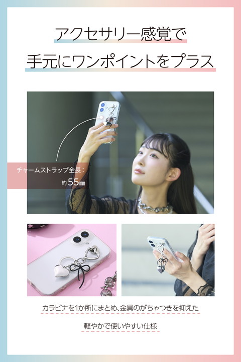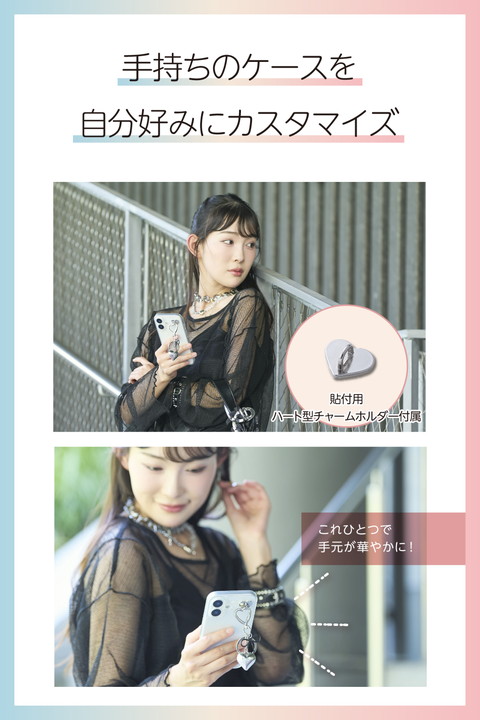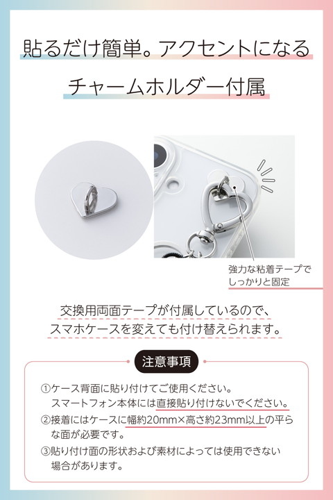 ブラックリボンの落ち着いた質感が、日常使いにほどよくなじむチャームストラップです。毎日持ち歩くスマホを、自分好みに手軽にカスタマイズできるアイテムで、気分に合わせておしゃれを楽しめます。スマホケースにストラップホールがなくても使える、強力粘着テープ付きのハート型チャームホルダーが付属しています。