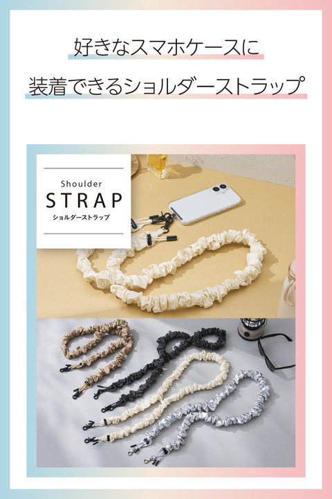 くしゅくしゅとした立体感が目を引く、ミニマルかつスポーティーな印象のスマホショルダーストラップです。両手が空いて、普段のお出かけはもちろん、お仕事や旅行などのイベント時にも活躍。落下、盗難、紛失防止にもなります。軽量なポリエステル素材で肩にやさしく、長さ調整も可能なため自分らしいスタイルで使えます。