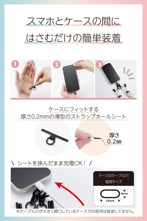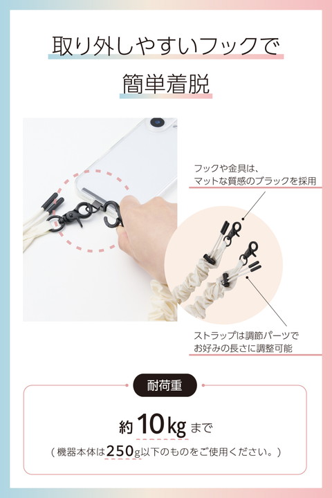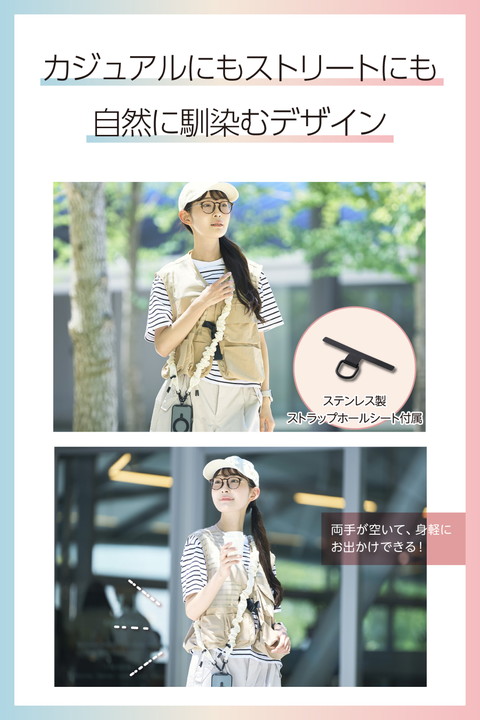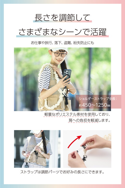 くしゅくしゅとした立体感が目を引く、ミニマルかつスポーティーな印象のスマホショルダーストラップです。両手が空いて、普段のお出かけはもちろん、お仕事や旅行などのイベント時にも活躍。落下、盗難、紛失防止にもなります。軽量なポリエステル素材で肩にやさしく、長さ調整も可能なため自分らしいスタイルで使えます。![]() ■くしゅくしゅとした立体感が目を引く、シンプルながら存在感のあるスマホショルダーストラップです。 ■ミニマルでスポーティーな印象が、カジュアルにもストリートにも自然に馴染みます。 ■気分やファッションに合わせて選べる、幅広いカラーバリエーションが魅力です。 ■両手が空いて身軽になるので、普段のお出かけはもちろん、お仕事や旅行など、さまざまなシーンで活躍。落下、盗難、紛失防止にもなります。 ■軽量なポリエステル素材を使用しており、肩への負担を軽減します。 ■ストラップは調節パーツでお好みの長さにできます。 ■取り外しやすいフックを使用しているので、ストラップの着脱が簡単にできます。 ■フックや金具は、マットな質感のブラックを採用しています。 ■ケースにストラップホールがなくても、付属のストラップホールシートをスマートフォンとケースの間に挟むだけで使用でき、取り外しも簡単です。 ■ステンレス製ストラップホールシート付きで、通常製品の約4倍の耐久性があります。 ※当社従来品P-STSDH2LR04BKとの比較 ■ケースにフィットする0.2mmの薄型のストラップホールシートで簡単に装着できます。 ■※ケースの種類は、ハイブリッドケース、ソフトケースをご使用ください(ケース背面が硬い素材のものを推奨します)。シリコン製のケースには使用しないでください。 ■※ケーブル穴が大きく開口しているケースでの使用は推奨してません。 ■※耐荷重は約10kgまでです。また、250g以上の機器本体には使用しないでください。 ■自社環境認定基準を1つ以上満たし、『THINK ECOLOGY』マークを表示した製品です。 ■環境への負荷軽減のため、輸送効率を高める設計の外装箱を使用した製品です。 ![]() ■サイズ:ショルダーストラップ:全長約450mm〜約1250mm、ストラップホールシート:W約45mm×D約0.2mm×H約23mm ■耐荷重:約10kgまで ※250g以上の機器本体には使用しないでください。 ■セット内容:ショルダーストラップ、ストラップホールシート(1口)1枚 ■材質:ショルダーストラップ:ポリエステル・亜鉛合金・ポリアセタール、ストラップホールシート:ステンレス ■カラー:アイボリー |