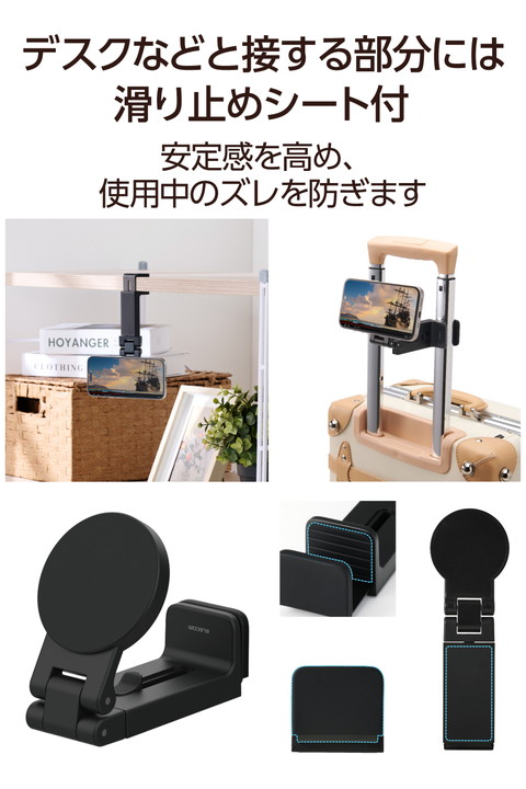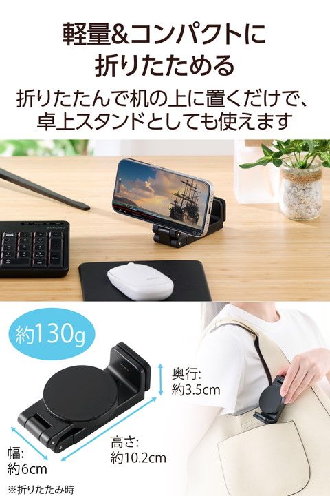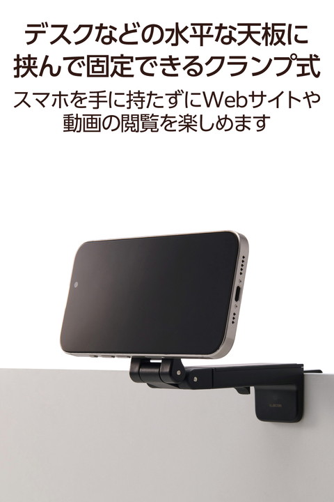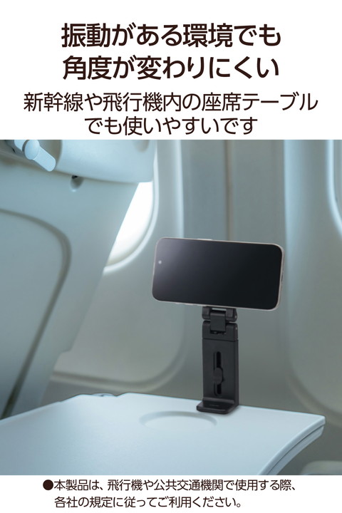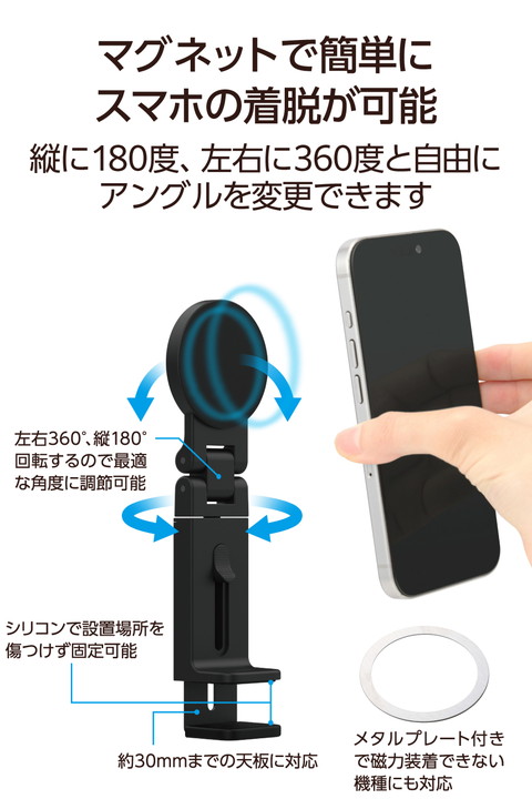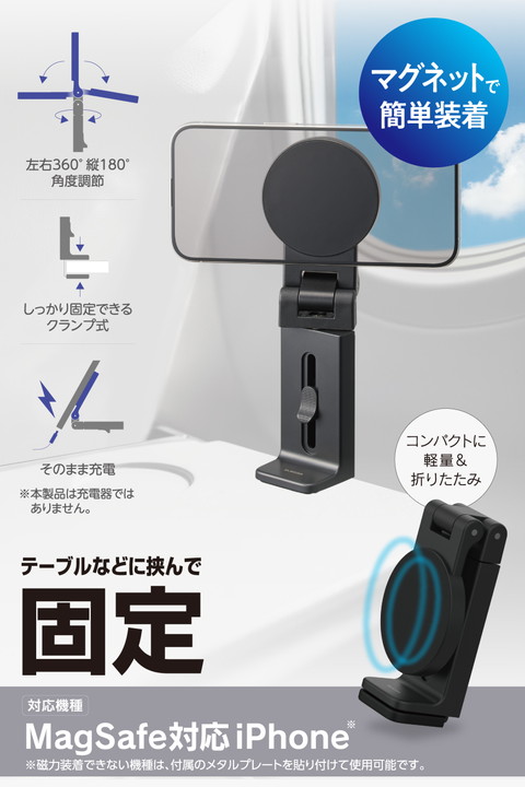 手ぶらで動画&Webを楽しめる!天板に挟んで固定できる、クランプ式のスマホスタンドです。新幹線や飛行機内の座席テーブルでの使用にもおすすめ。マグネットで簡単にスマートフォンの着脱が可能で、MagSafe非対応の機種でも使用できるメタルプレートを付属しています。![]() ■デスクなどの水平な天板に挟んで固定できるクランプ式で、スマートフォンを手に持たずにWebサイトや動画の閲覧を楽しめます。新幹線や飛行機内の座席テーブルでの使用にもおすすめです。 ■マグネットで簡単にスマートフォンの着脱が可能。着信やメッセージなどあった際も、すぐに確認できます。 ■付属のメタルプレートをスマホケースや端末に貼り付けることで、MagSafe非対応の機種でも使用可能になります。 ■※使用するケースの材質、厚みによっては対応できない場合がありますのでご了承ください。 ■軽量&コンパクトに折りたためるので、持ち運びに便利です。 ■折りたたんで机の上に置くだけで、卓上スタンドとしても使えます。 ■縦に180度、左右に360度と自由にアングルを変更可能。縦向きでも横向きでもシーンに合わせて使用できます。 ■振動がある環境でも揺れによって角度が変わりにくい設計です。 ■クランプの内側や、スタンドとして使用する際にデスクなどと接する部分には、滑り止めシートが付いています。安定感を高め、使用中のズレを防ぎます。 ■※本製品は、飛行機や公共交通機関で使用する際、各社の規定に従ってご利用ください。 ■自社環境認定基準を1つ以上満たし、『THINK ECOLOGY』マークを表示した製品です。 ■環境保全に取り組み、製品の包装容器が紙・ダンボール・ポリ袋のみで構成されている製品です。 ![]() ■材質:スタンド:ABS・シリコン・ステンレス、メタルプレート:鉄 ■外形寸法:スタンド:幅約60mm×奧行約35mm×高さ約102mm(折りたたみ時) ■対応機種:MagSafe対応iPhone ※磁力装着できない機種は、付属のメタルプレートを貼り付けて使用可能です。 ■対応サイズ:クランプ対応板厚:〜約30mm ※クランプ使用時、必ず平面部分に取り付けてください。円柱には取り付けできません。 ■重量:約85g(スタンドのみ) ■耐荷重:約300g ■カラー:ブラック ■内容物:スタンド×1、メタルプレート×1 ■角度調節:○ |