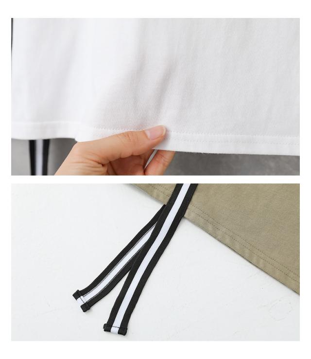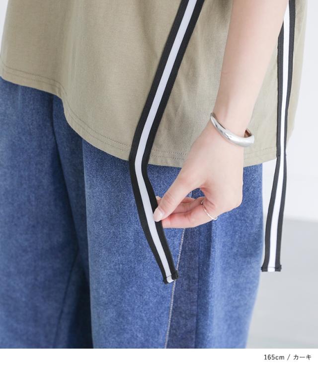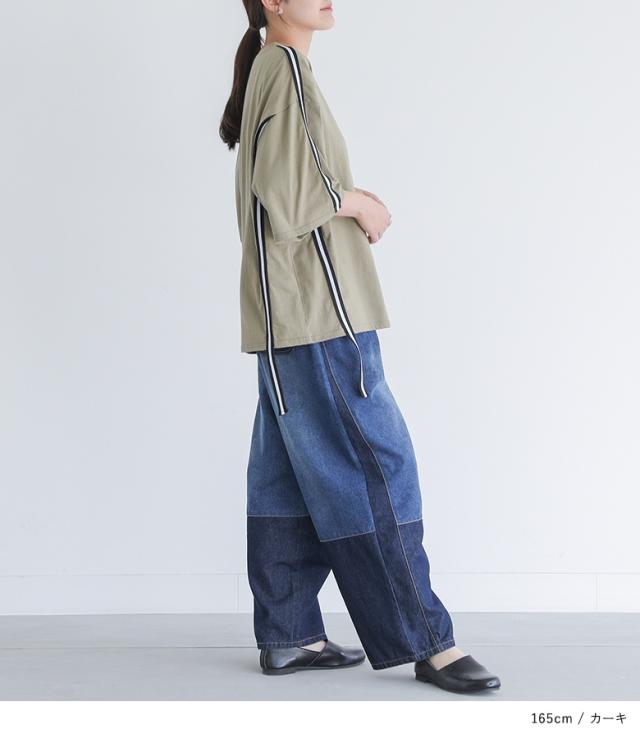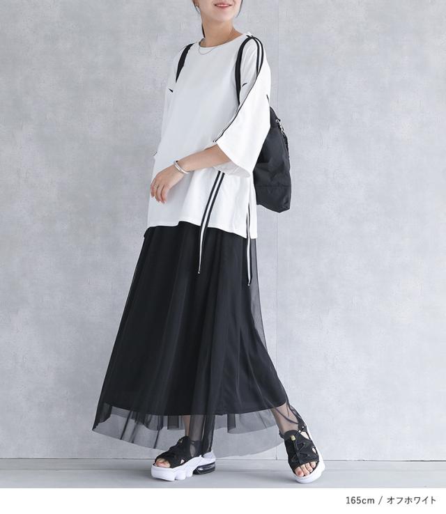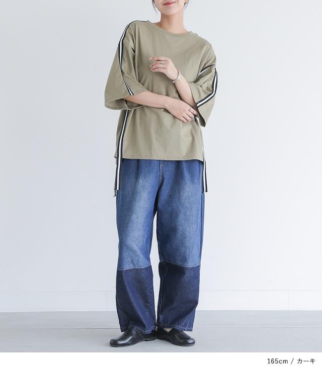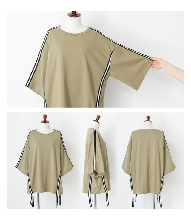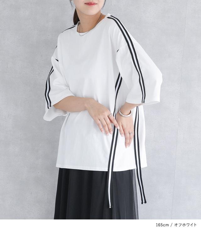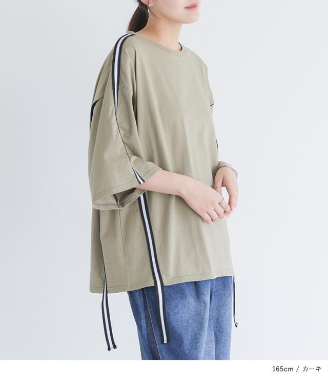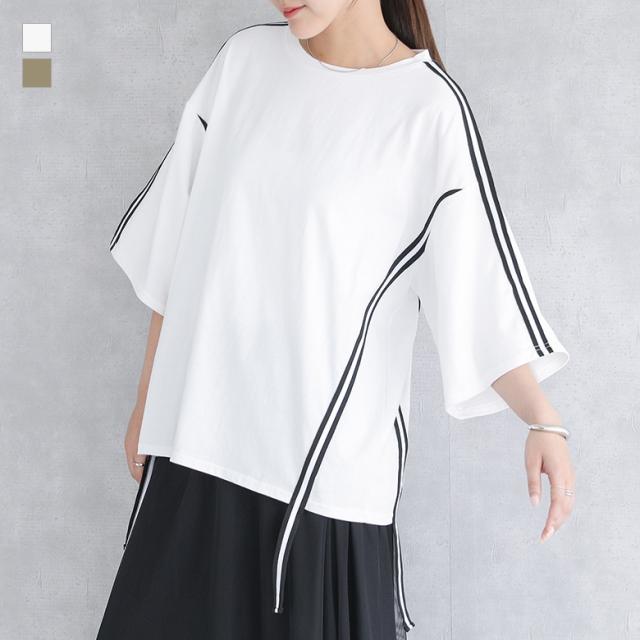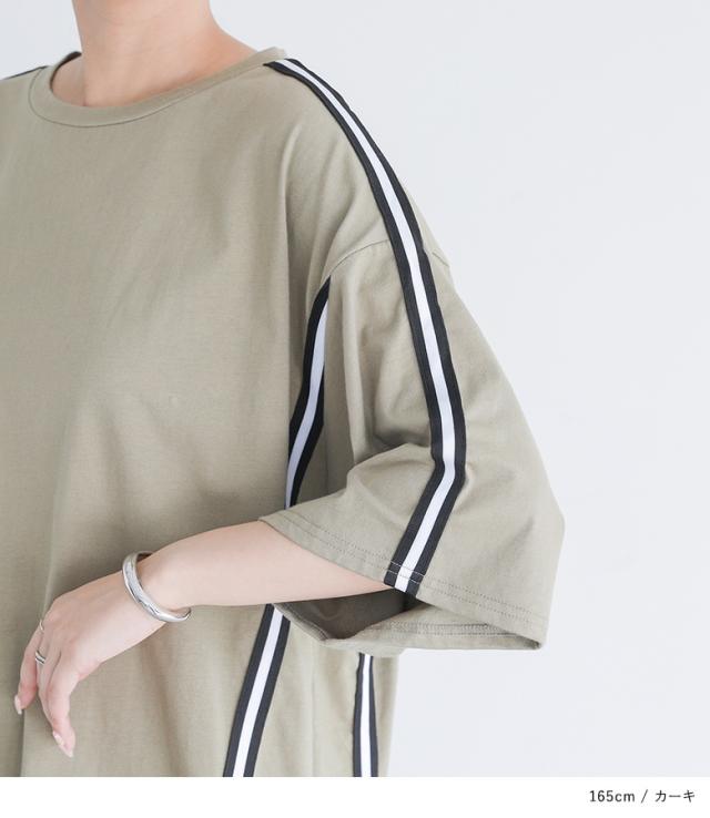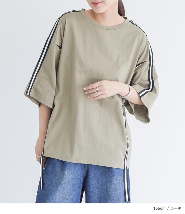 『ラインテープオーバーTシャツ』【メール便不可】【20】[Tシャツ レディース トップス カットソー 半袖 五分袖 ラインテープ 綿100% クルーネック ゆったり 二の腕カバー オーバーサイズ 春 夏 秋]
