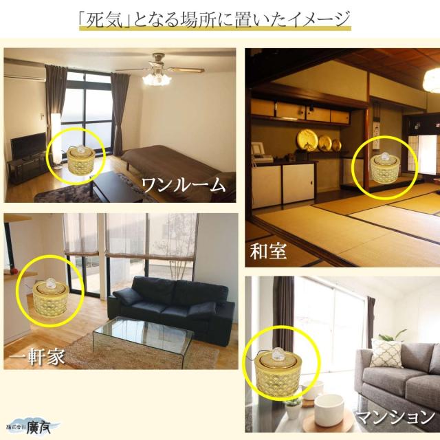 紫白九星派とは、「玄関の向き」で家の中を八方位に分ける風水の代表的な派で、この紫白九星派で八方位に分けた内の「死気」の方位に『龍珠(噴水)』を置いていただくのがオススメです。