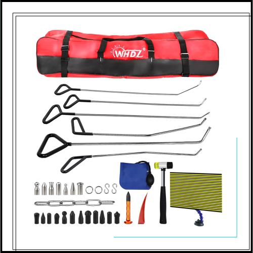 【お得な36点セット】このデントリペアツールセットは型違ったデントリペアツール*6、S型の鈎*2、鉄輪*2、ステンレスチェーン*1、修復ツールヘッド黒いタイプ*12、修復ツールヘッド金属タイプ*7、レッドドアウェッジ*1、オレンジ修復ペン*1、修復槌*1、気嚢 *1、凹み検査工具セット*1、収納バッグ*1があります。