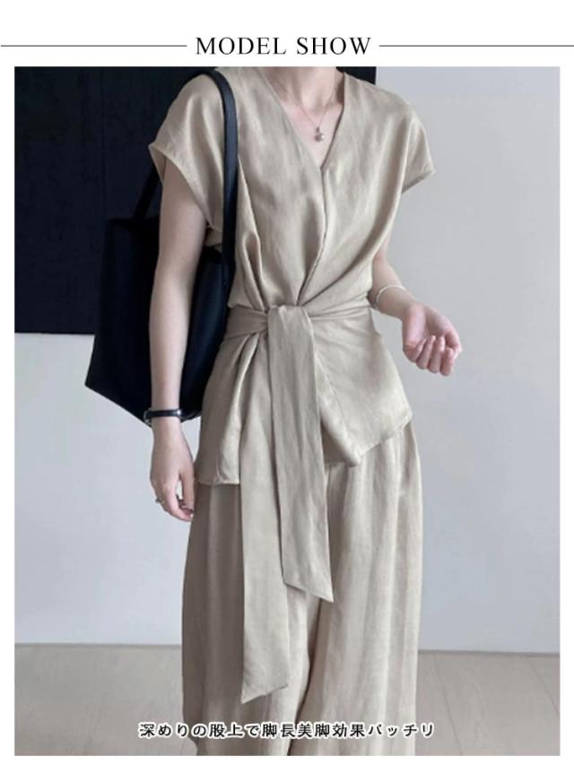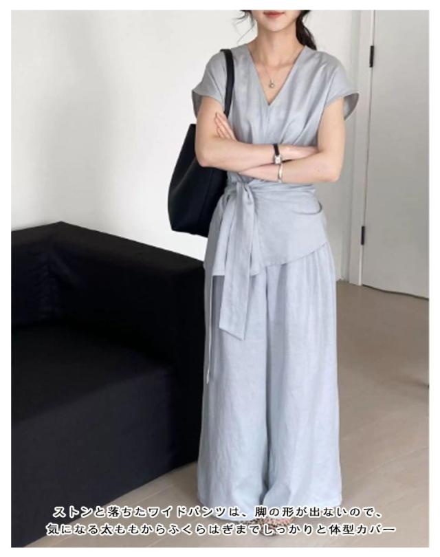 麻調セットアップ レディース 春夏 半袖 レディースセットアップ セットアップ 上下セット 韓国ファッション 夏服 接触冷感 リネンライク ワイドパンツ ブラウス フレンチ袖 ウエストリボン ワイドパンツ パンツスーツ 無地 送料無料