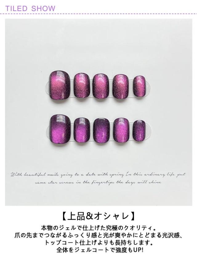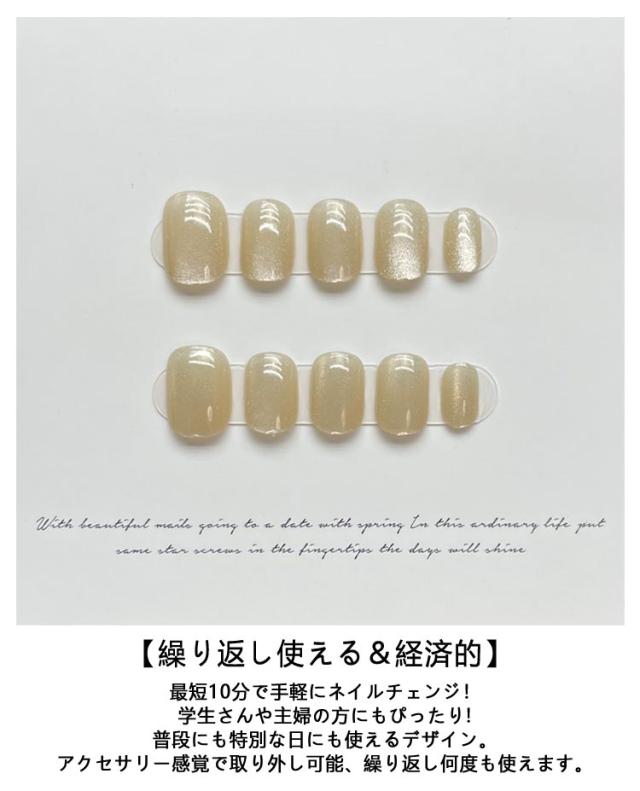 | 2色(20枚入り)選べる!(同じ色もOK) 高見えするキャッツアイネイルチップ、繰り返し使える。 【上品&オシャレ】本物のジェルで仕上げた究極のクオリティ。爪の先までつながるふっくり感と光が爽やかにとどまる光沢感、トップコート仕上げよりも長持ちします。全体をジェルコートで強度もUP!シンプル〜華やかなスタイルまで幅広くお使いいただけます。普段のオシャレやオフィスシーン、卒業式、入学式などでも大活躍。 【使いやすい】貼るだけのネイルチップ。不器用な初心者でも簡単に美しく仕上げる事が出来ます。その日のファッションに合わせて気軽にコーディネート出来ます。 【繰り返し使える&経済的】 最短10分で手軽にネイルチェンジ!学生さんや主婦の方にもぴったり!普段にも特別な日にも使えるデザイン。アクセサリー感覚で取り外し可能、繰り返し何度も使えます。 【貼るだけですぐに本格ネイルの出来上がり】普段はネイルが出来ない方や忙しくてサロンに行けない方にぴったり。 | |
