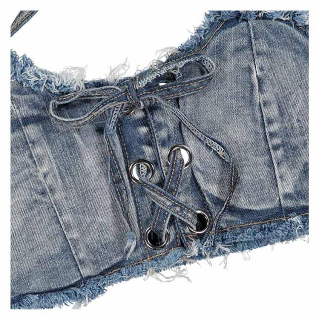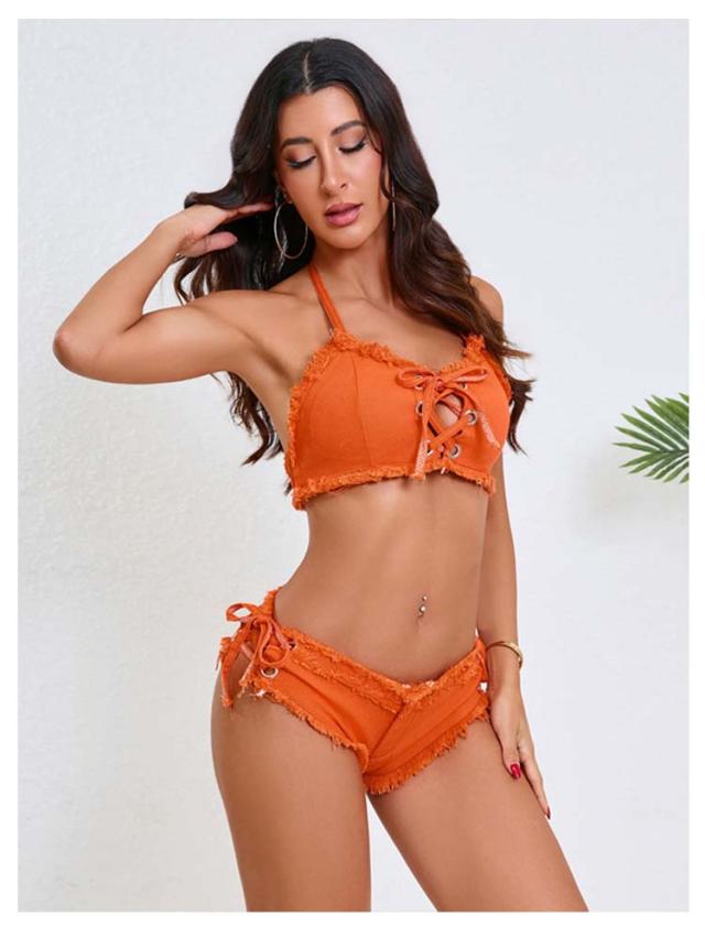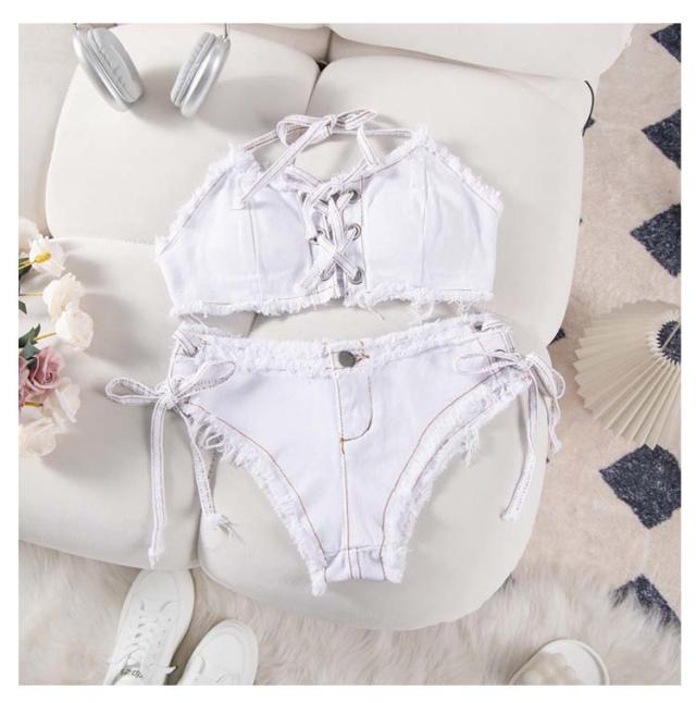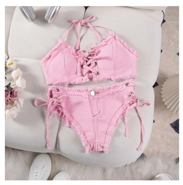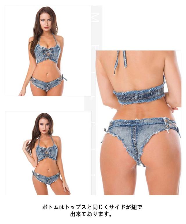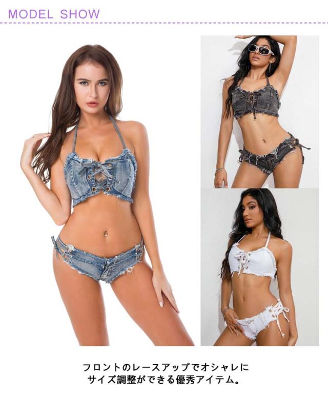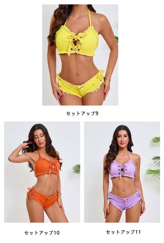 | 選べる11色!ビーチ映えするレースアップデザインのデニムビキニ。 フロントのレースアップでオシャレにサイズ調整ができる優秀アイテム。 ノンワイヤーでストレスフリーな着心地。 ボトムはトップスと同じくサイドが紐で出来ております。 | |