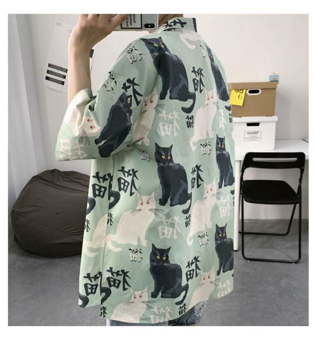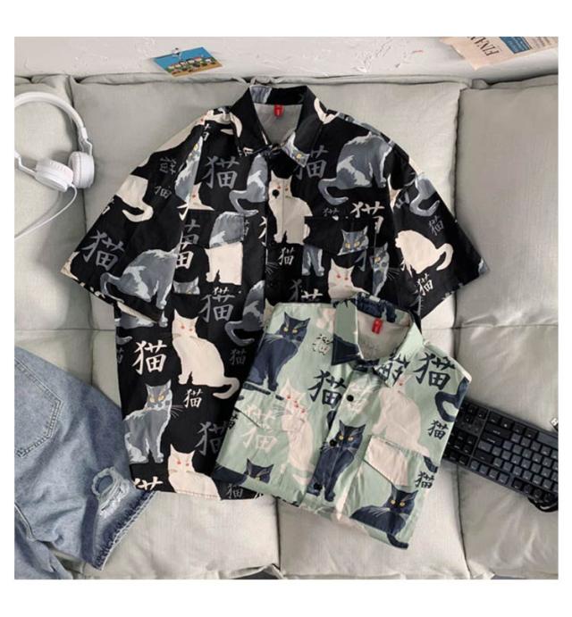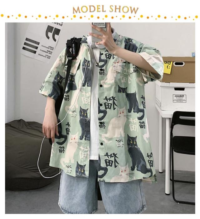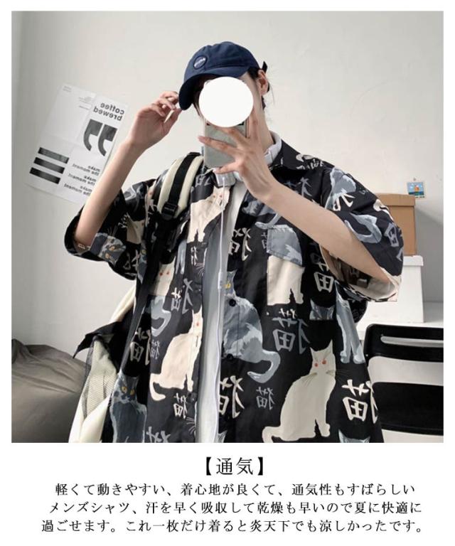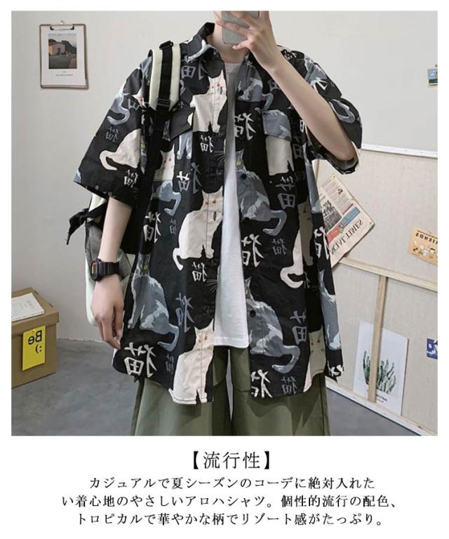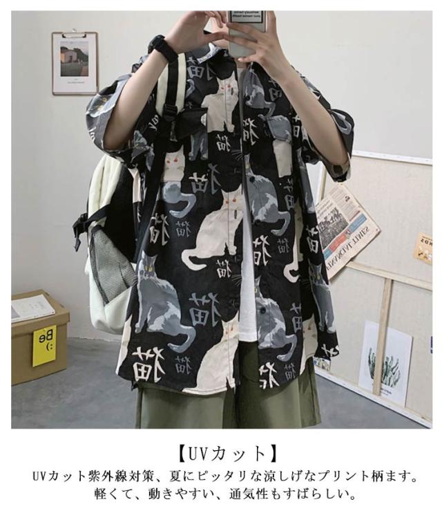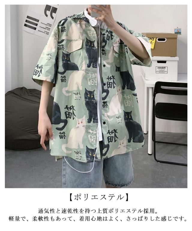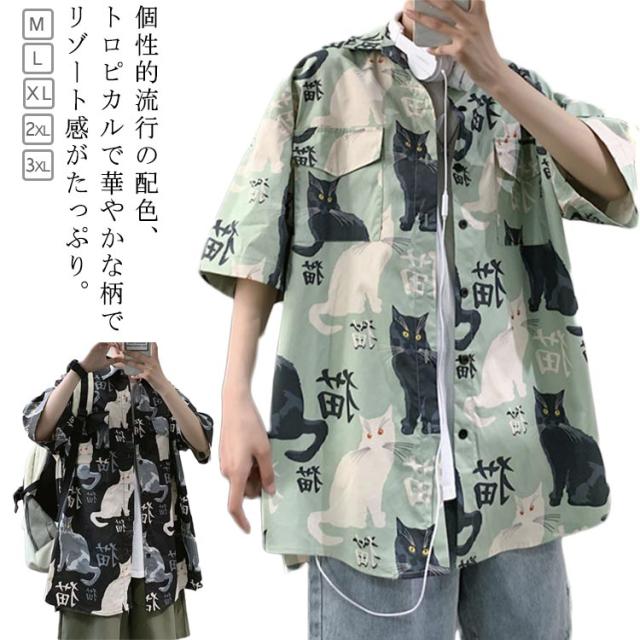 半袖 アロハシャツ 通気 羽織り 前開き 春夏 トップス 五分袖 カジュアルシャツ 猫柄 大きいサイズ プリント 半袖シャツ 夏 羽織り 薄手 オーバーサイズ シャツ ゆったり 可愛い おもしろ 開襟シャツ ビーチ カジュアル プリント ねこ かわいい おしゃれ