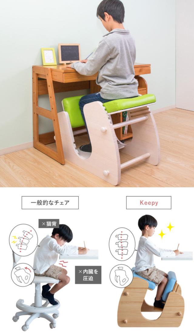 一般的なチェアは前のめりになりがちで、これでは姿勢も目も悪くなってしまいます。Keepyなら、斜めの座面が立ち姿勢のように骨盤が立つので自然と背中がS字カーブを描き、理想的な姿勢を作り出せます。骨盤や骨格への圧迫が少なく、内臓への負担も軽減するお子様の体に優しいチェアです。