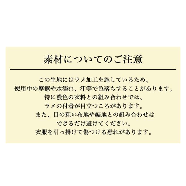 | ※注意点 | 摩擦、水濡れ、汗の影響によって色落ちすることがあります。 鋭利な形状の物を入れないで下さい。破損、破れの恐れがあります。 火の近くおよび高温の場所に近づけたり、放置したりしないで下さい。 汚れを落とす場合は、水や中性洗剤を使い固く絞った布で拭き取ってください。 シンナー、ベンジンなどの有機溶剤の使用は色落ち、変色およびプリントや樹脂加工の剥がれなどの原因となります。 また、洗濯もこれらの原因となりますのでおやめ下さい。 ご使用後はよく陰干しをし、直射日光を避け風通しのよい場所で保管ください。 乱暴なお取り扱いはおやめください。 ※商品の画像は、できるだけ商品に近いカラーにて掲載をしております。 お客様のモニターの発色または設定により、実際の色味と異なる場合もあります。あらかじめご了承ください。 メーカーサイズ、もしくは実際に測った寸法となります。商品の素材等の個体差により、若干サイズのばらつきがあります。サイズはあくまでも目安としてお考えください。 本製品は、より良い品質・機能性の向上を目的として、予告なく仕様変更となる場合がございます。 デザインなど一部が画像と異なる可能性がございますので、あらかじめご了承ください。 ※特殊なラメ加工を施しています。素材の注意点の画像をご確認ください。 |