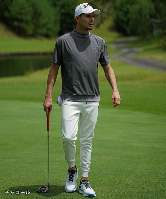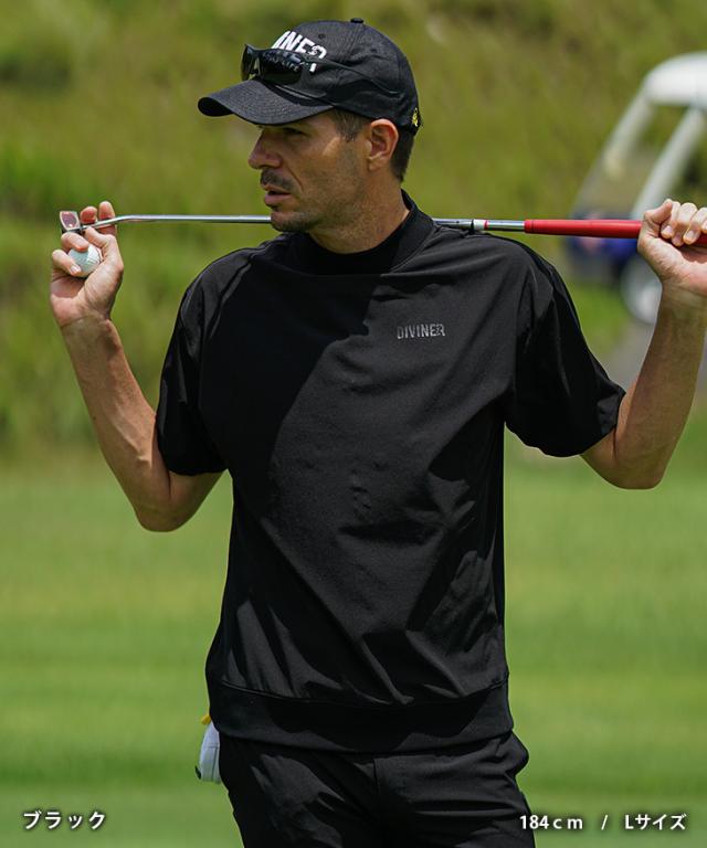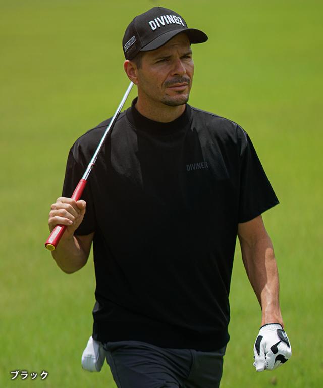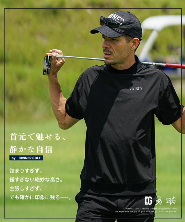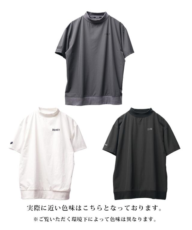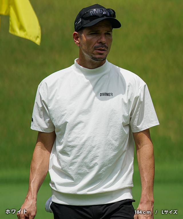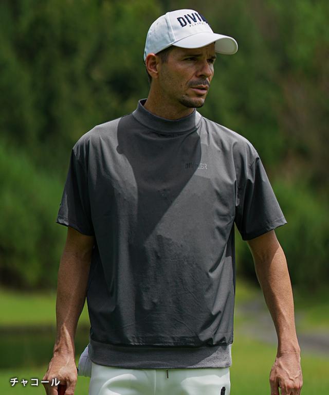 DIVINER GOLF(ディバイナーゴルフ)『シャカ素材半袖モックネック』【シャカピステリブ半袖モックネック】■Design / デザインほどよくゆとりを持たせたリラックスシルエットに、モックネックを組み合わせることで、スポーティながらも洗練された印象に仕上げた1枚。左胸にはシンプルなブランドロゴプリントを、右袖には立体的なゴムプレートを配置し、控えめながらも個性の光るデザインに。また、ホワイトは透けを防ぐための裏地付き。ブラックとチャコールは、裏地なしの仕様で通気性と動きやすさを重視した設計となっています。1枚で着用してもシルエットがきれいに決まり、プレー中の動きやすさも確保。汗ばむラウンド中でも快適さをキープし、見た目・機能性ともに妥協のないゴルフ仕様のモックネック。
