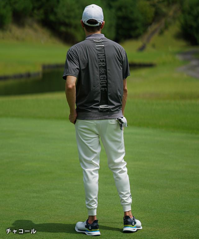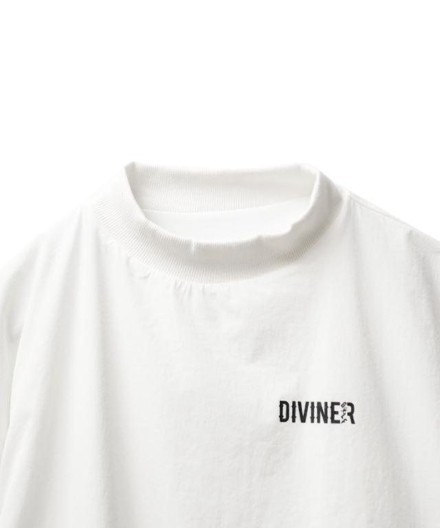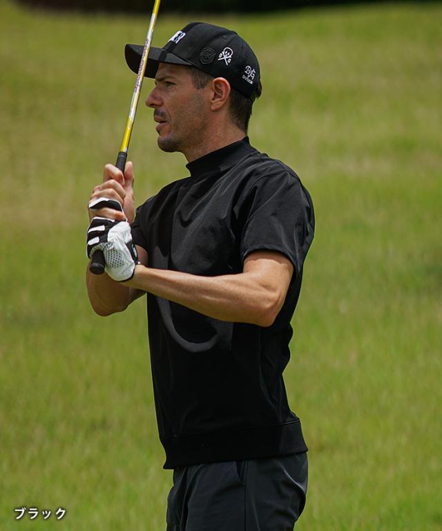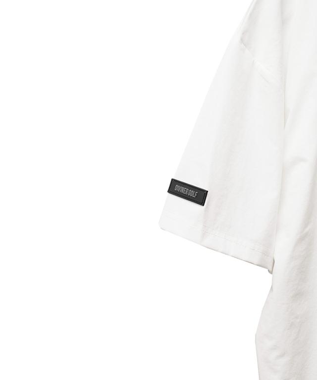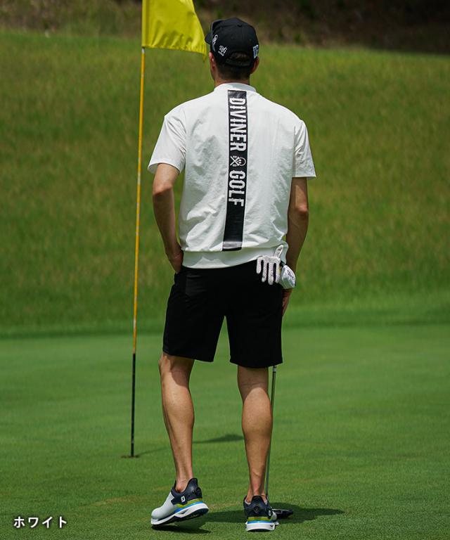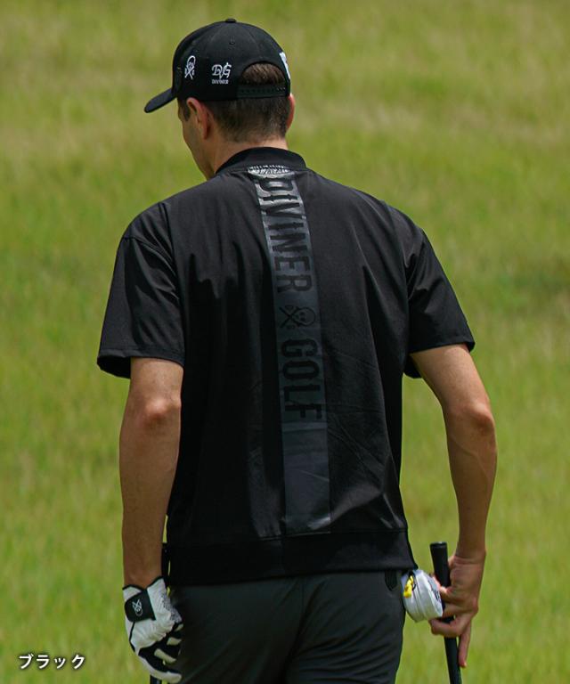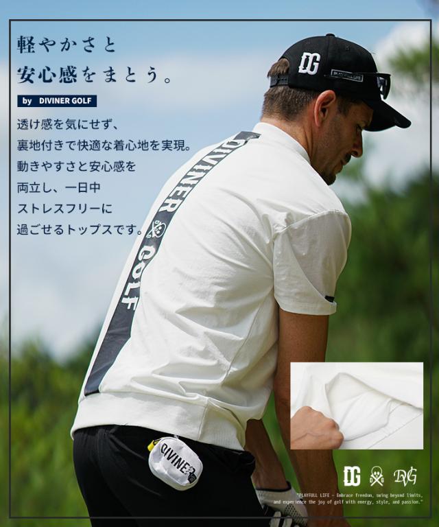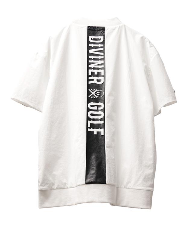 DIVINER GOLF(ディバイナーゴルフ)『シャカ素材半袖モックネック』【シャカピステリブ半袖モックネック】■Design / デザインほどよくゆとりを持たせたリラックスシルエットに、モックネックを組み合わせることで、スポーティながらも洗練された印象に仕上げた1枚。左胸にはシンプルなブランドロゴプリントを、右袖には立体的なゴムプレートを配置し、控えめながらも個性の光るデザインに。また、ホワイトは透けを防ぐための裏地付き。ブラックとチャコールは、裏地なしの仕様で通気性と動きやすさを重視した設計となっています。1枚で着用してもシルエットがきれいに決まり、プレー中の動きやすさも確保。汗ばむラウンド中でも快適さをキープし、見た目・機能性ともに妥協のないゴルフ仕様のモックネック。