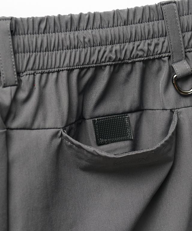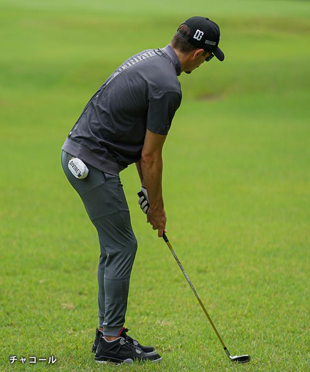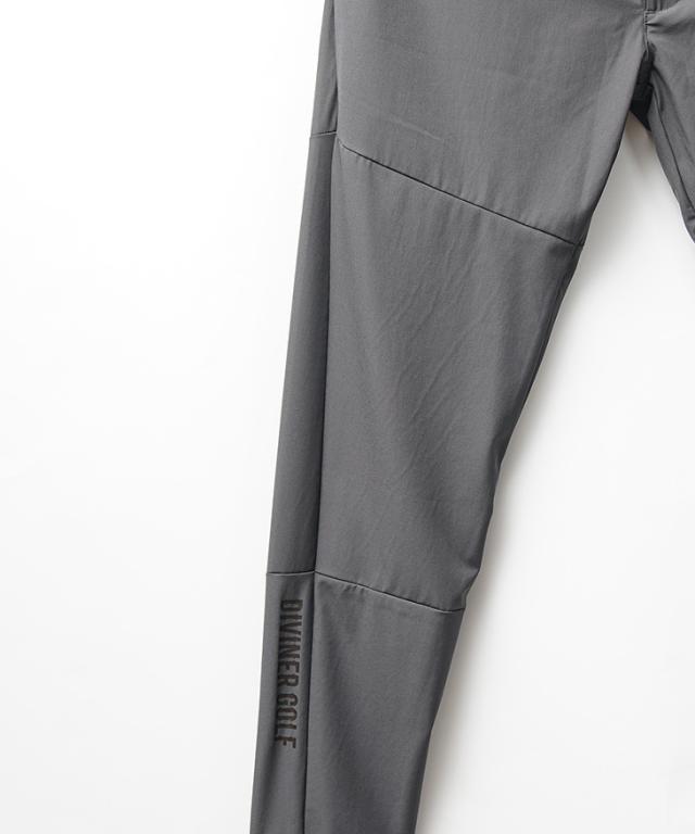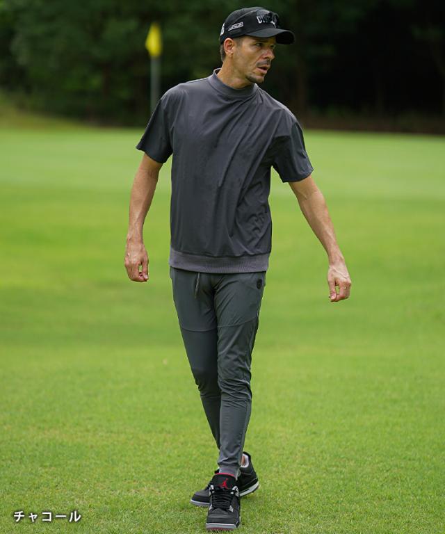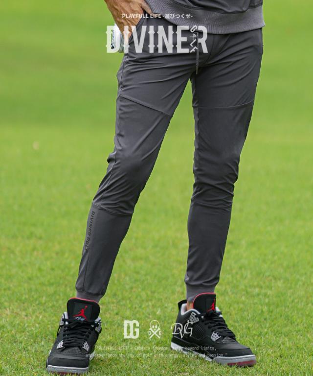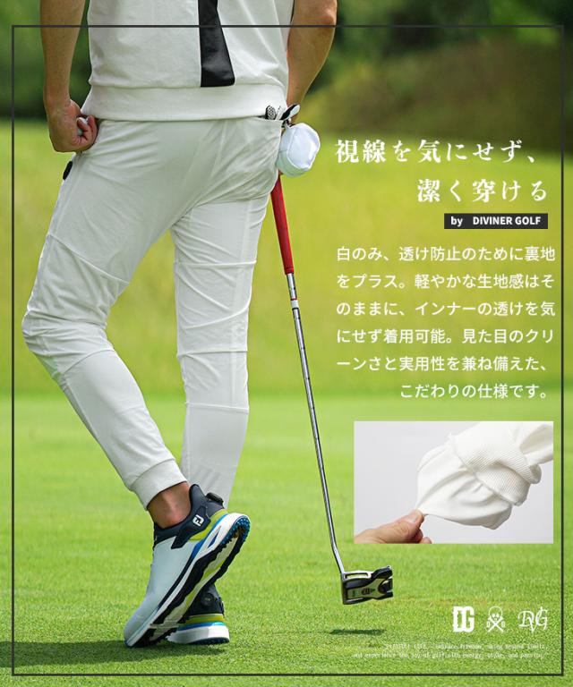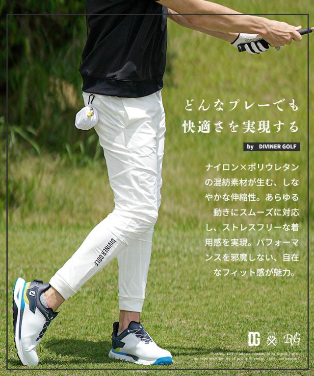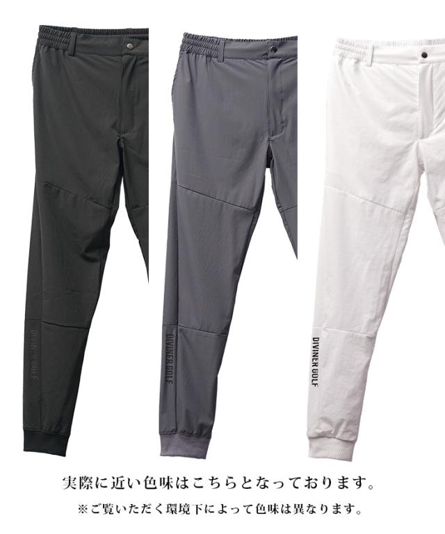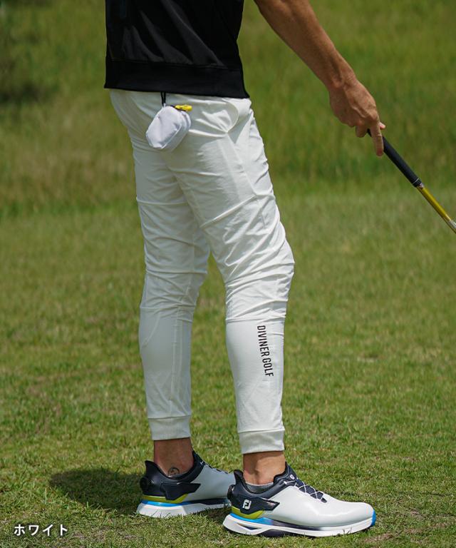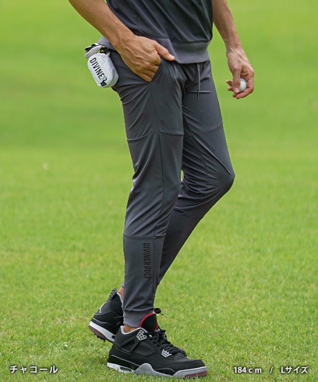DIVINER GOLF(ディバイナーゴルフ)『シャカ素材ジョガーパンツ』【シャカジョガーパンツ】■Design / デザインスッキリとしたややタイトめのシルエットながら、ストレッチ性に優れた素材で快適な動きやすさを確保。足元までカバーするロング丈は、日差しや芝の擦れから肌を守りつつ、きちんと感のある見た目も両立します。ウエストはゴム+ドローコードに加え、ボタン&ジップ仕様で安定した履き心地に。フロントに2つ、ヒップ右側に1つの大きめポケットを備え、実用性も抜群です。また、ホワイトは透けを防ぐための裏地付き。ブラックとチャコールは、裏地なしの仕様で通気性動きやすさを重視した設計となっています。