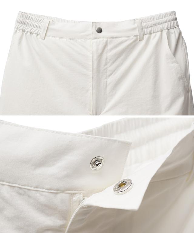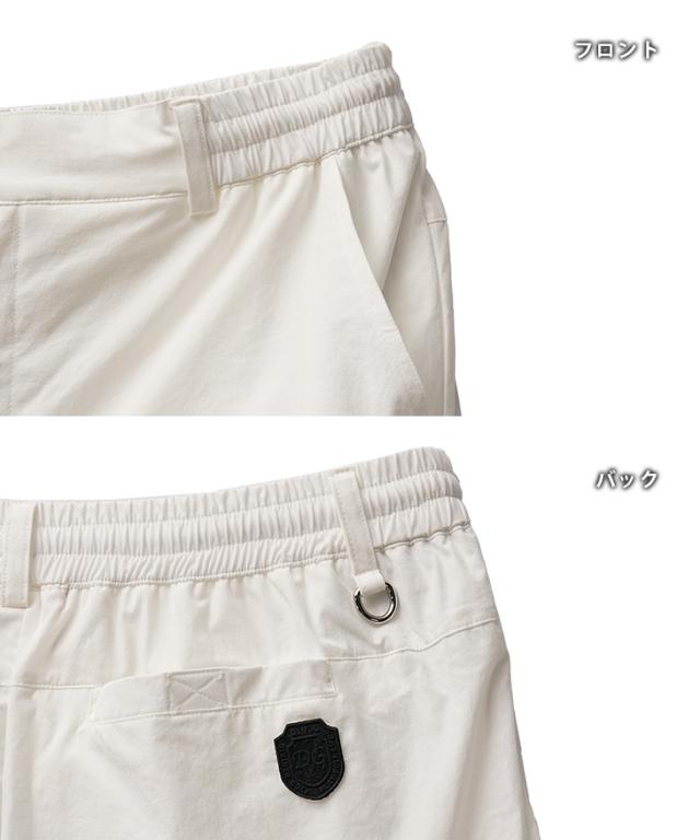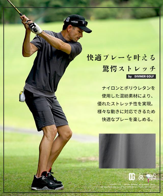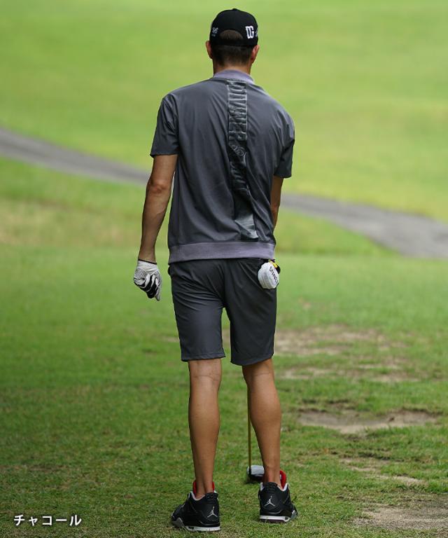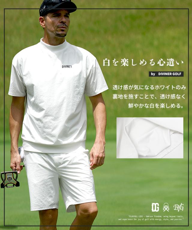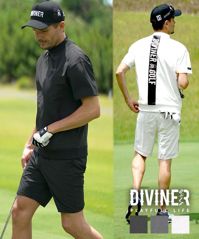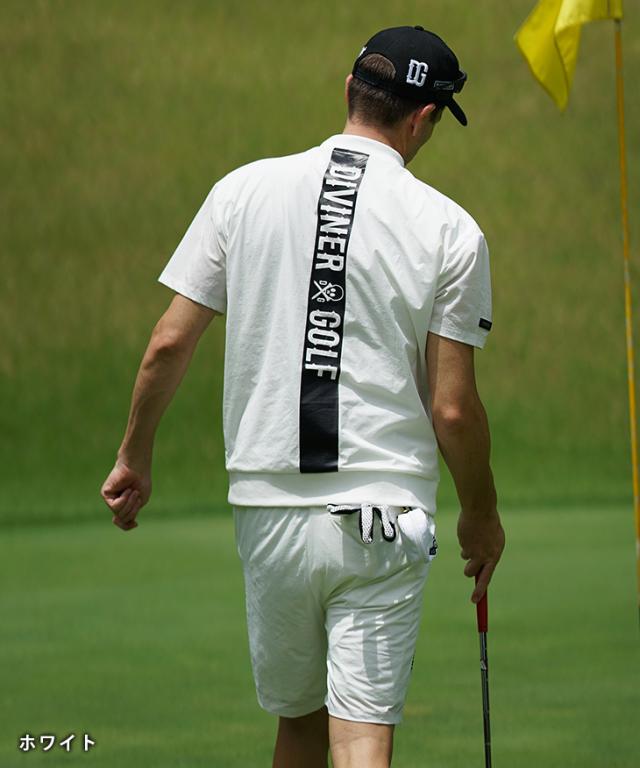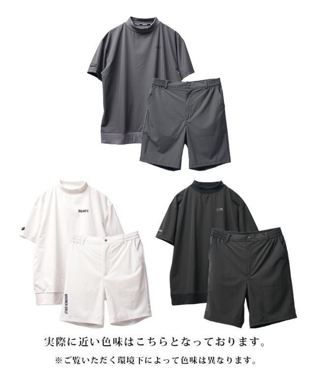 DIVINER GOLF(ディバイナーゴルフ)『シャカハーフパンツセット』【シャカハーフパンツセットアップ】■Design / デザインシャカっとした軽やかなストレッチ素材を使用したモックネックとハーフパンツのセットアップ。どちらも速乾性に優れ、汗ばむゴルフシーンで快適な着心地をキープします。ややゆったりめのトップスと膝上丈のハーフパンツの組み合わせは、動きやすさと涼しさを両立。ハーフパンツはウエストはゴム+ドローコード仕様で調整可能、さらに細部に施されたブランドロゴがスポーティなアクセントをプラスします。また、ホワイトは透けを防ぐための裏地付き。ブラックとチャコールは、裏地なしの仕様で通気性と動きやすさを重視した設計となっています。