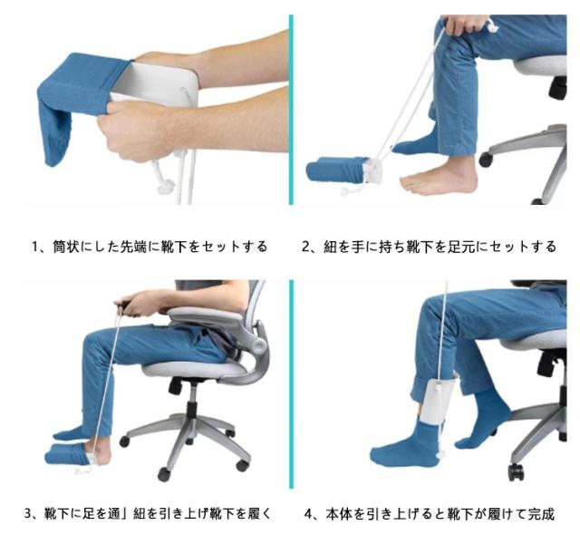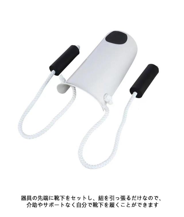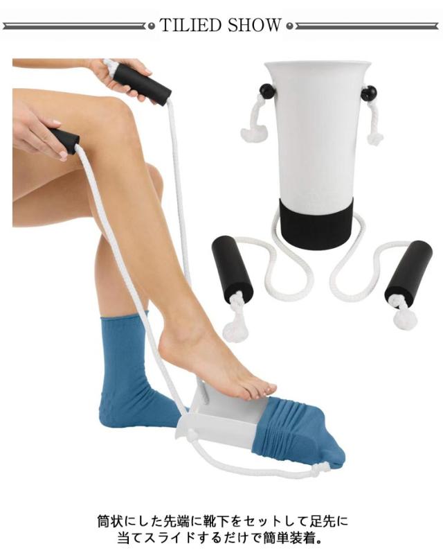 | 深くかがむことなく、靴下がはけるソックスエイドです。 筒状にした先端に靴下をセットして足先に当てスライドするだけで簡単装着。 器具の先端に靴下をセットし、紐を引っ張るだけなので、介助やサポートなく自分で靴下を履くことができます 楽な姿勢で装着することが可能なので、妊婦さんや片足を骨折した方、腰痛の方などにもおススメ! シンプル設計で軽量コンパクトなので、持ち運びや収納に便利。 | |