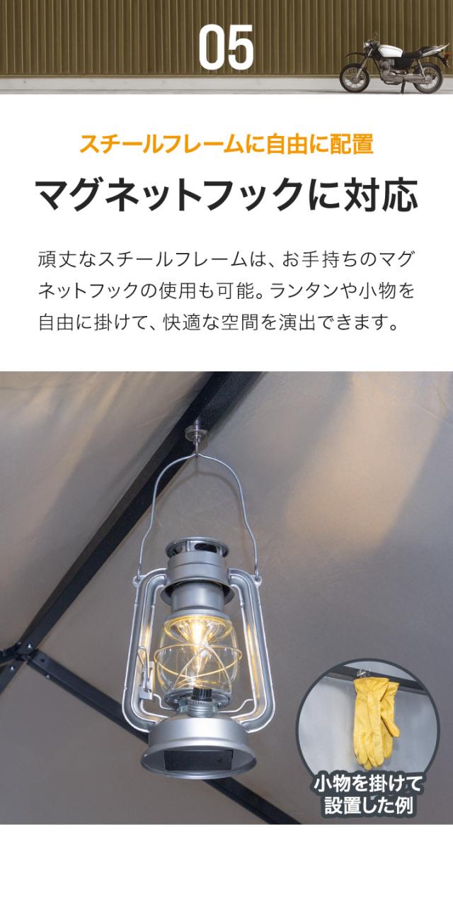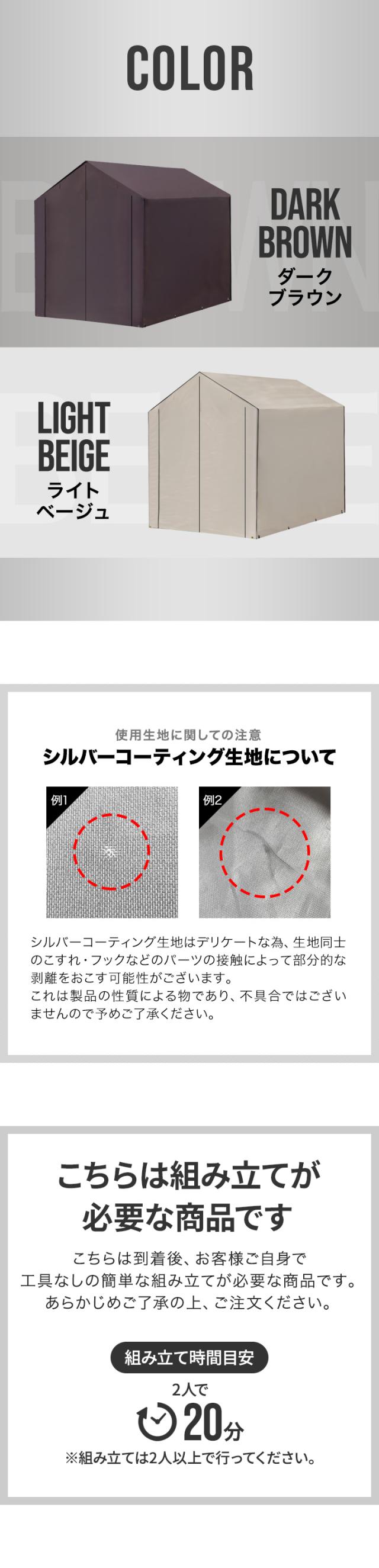 | 特記事項: ※組み立ては2人以上で行ってください。 ※台風などの強風時は使用を中止し、カバーは外してください。 風で飛ばされたり、転倒して周囲のものを破損・破壊させる原因となります。 ※固定金具を使用する場合、ペグ、釘打ちのハンマーは別途ご用意ください。 |