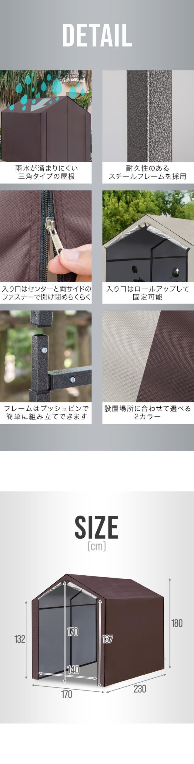 | サイズ: 組立時 : (約)幅170cm×奥行230cm×高さ180cm 入り口 : (約)幅140cm×高さ170cm |
