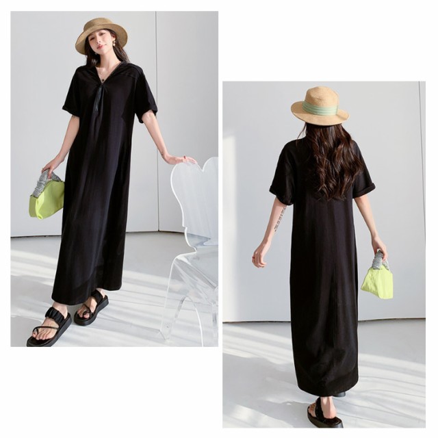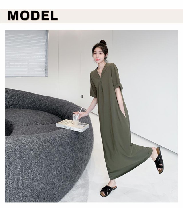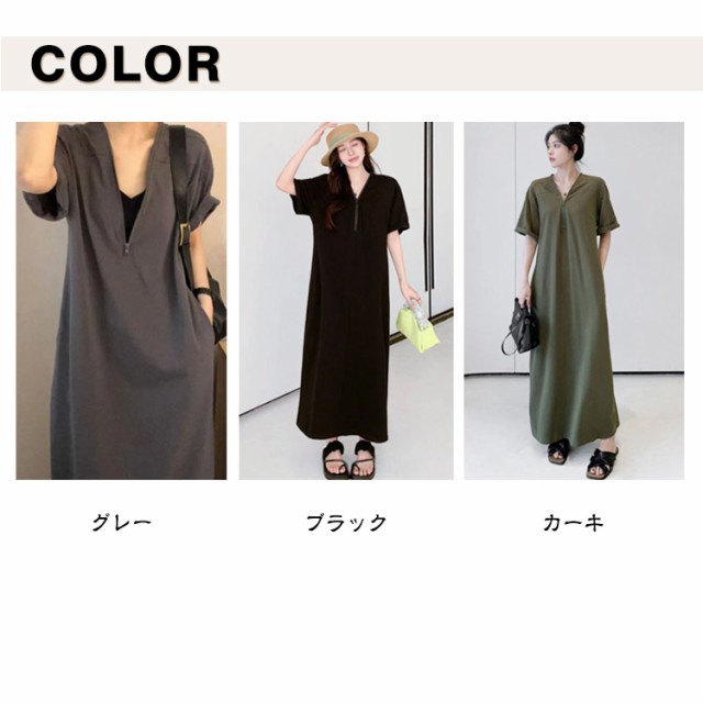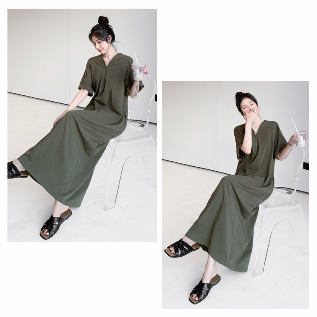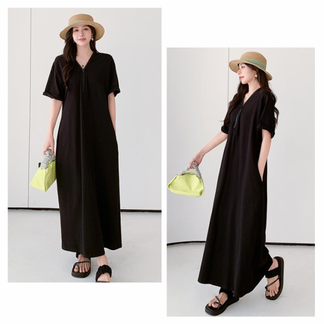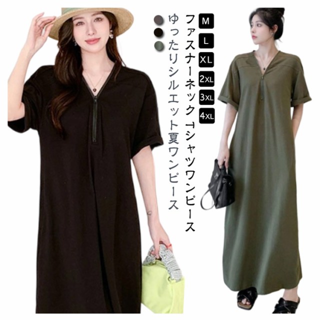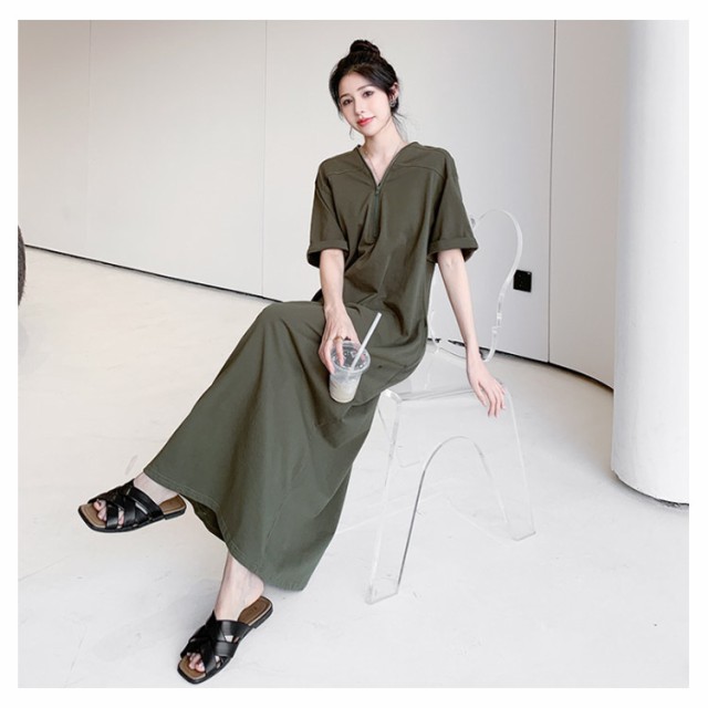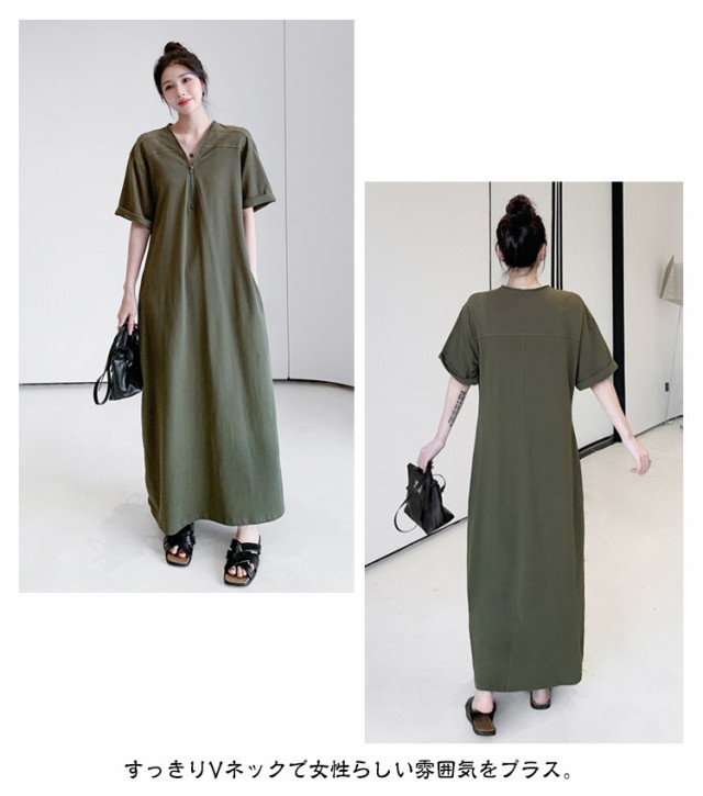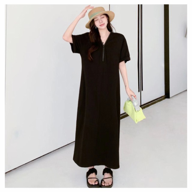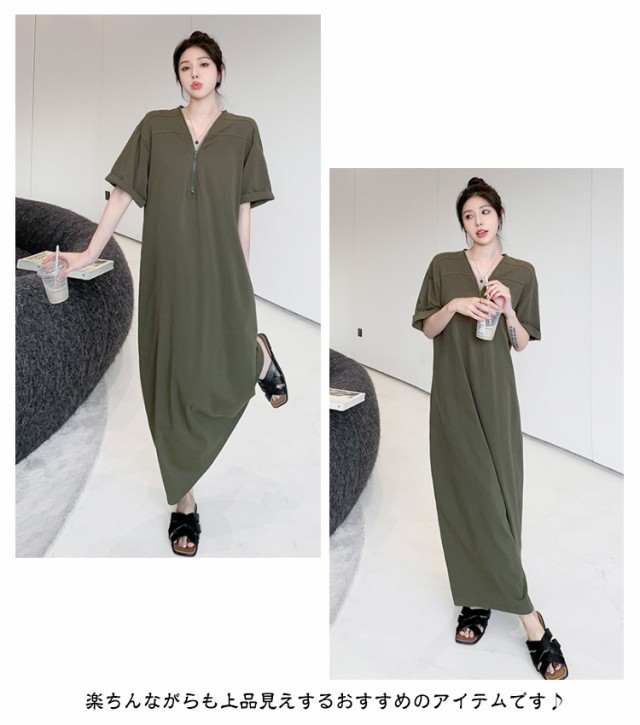 レディース ゆったり ワンピース ファスナーネック 半袖 ロングワンピース Tシャツワンピース マキシ丈 夏 無地 Vネック 体型カバー Tシャツワンピ ハーフジップ 夏 大きいサイズ 着痩せ カジュアル Tシャツワンピース 送料無料 黒 ブラック カーキ