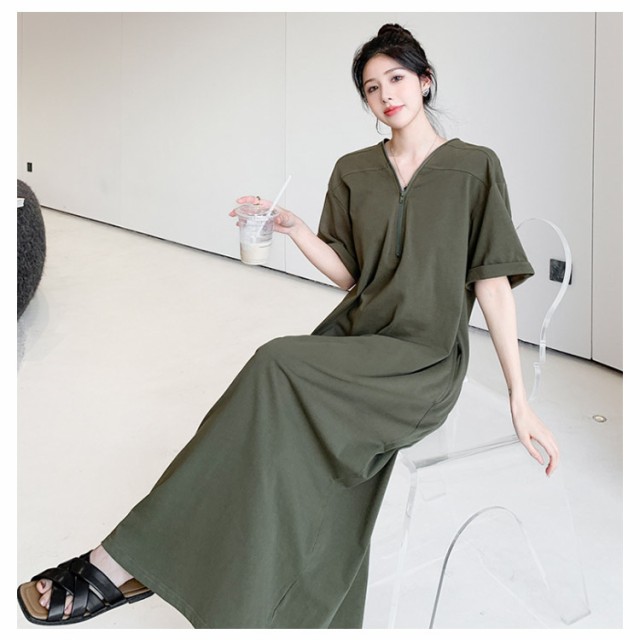 | ファスナーネック Tシャツワンピース ゆったりシルエット夏ワンピース すっきりVネックで女性らしい雰囲気をプラス。 楽ちんながらも上品見えするおすすめのアイテムです♪ | |