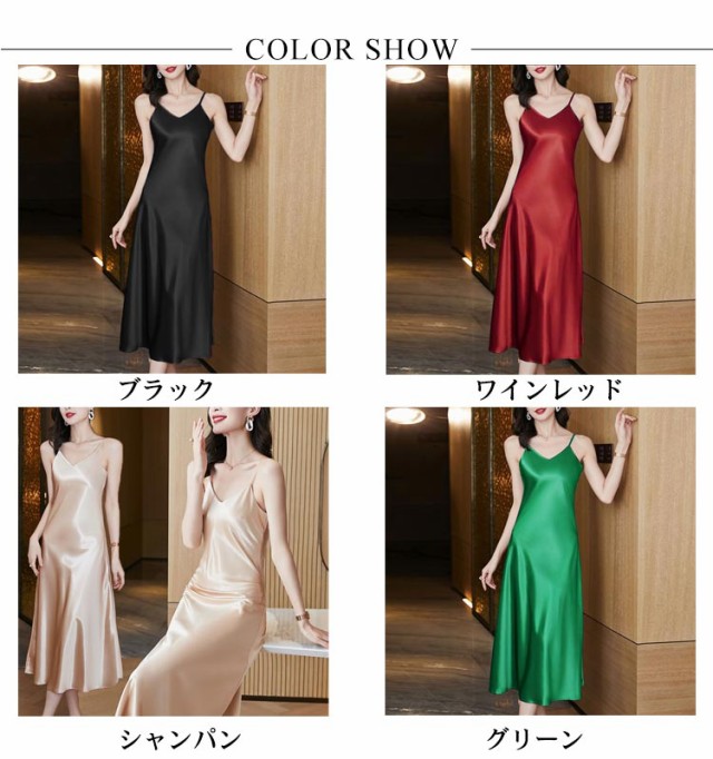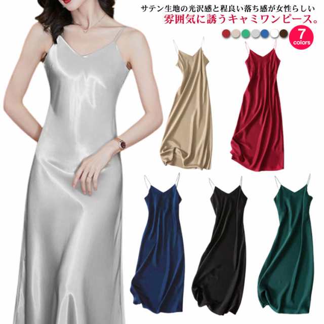 サテン レディース キャミワンピ Vネック シルクライク キャミワンピース ロング インナー ワンピース ロングワンピース 可愛い おしゃれ 30代 フィット 20代 大人 40代 50代 無地 シンプル 高級感 ツヤ 光沢感 キャミソール